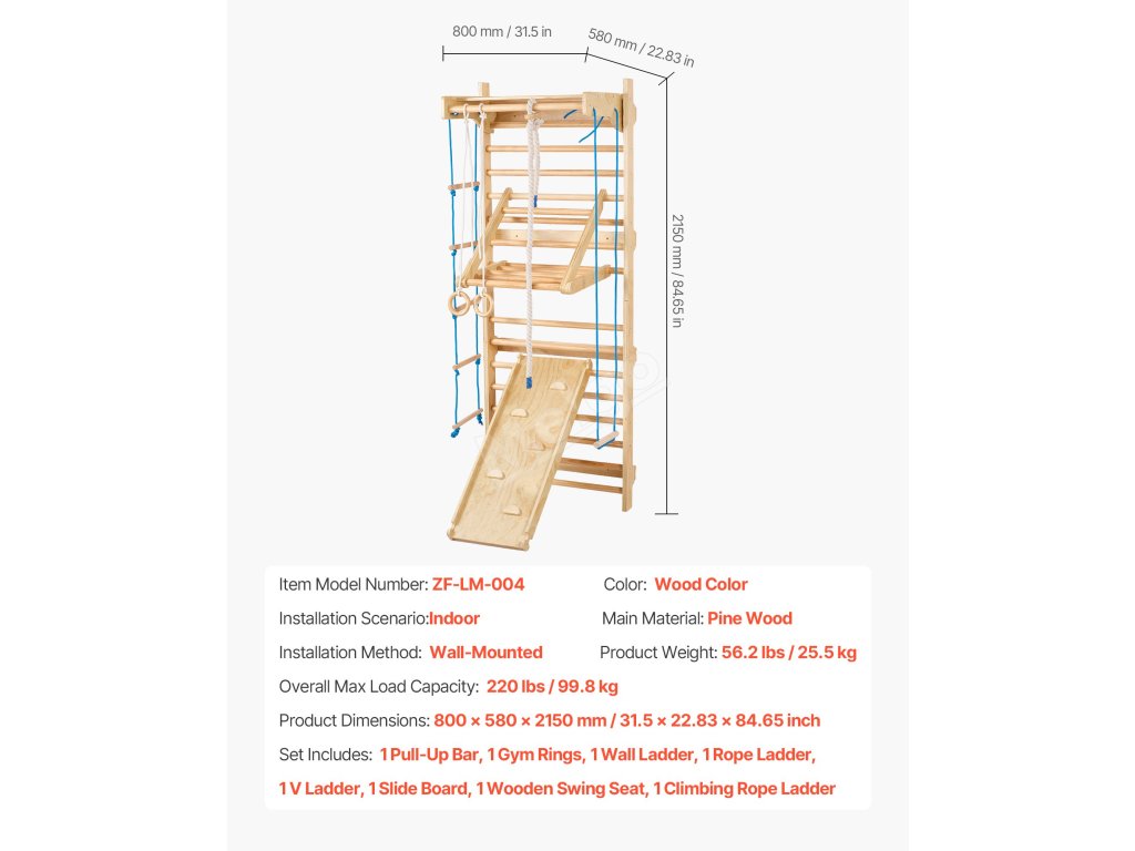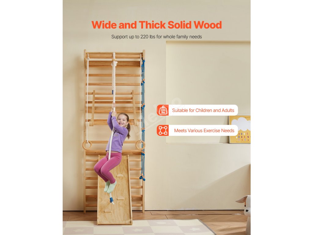 Tento 15stupňový švédský žebřík 8 v 1 obsahuje šplhací hrazdu, gymnastické kruhy, houpací sedátko, šplhací žebřík, nástěnný žebřík, provazový žebřík a další. Je vhodný pro děti od 3 let a pomáhá dětem budovat sílu, rovnováhu a sebedůvěru. Připevněte si ho na zeď a proměňte svůj domov v hřiště.