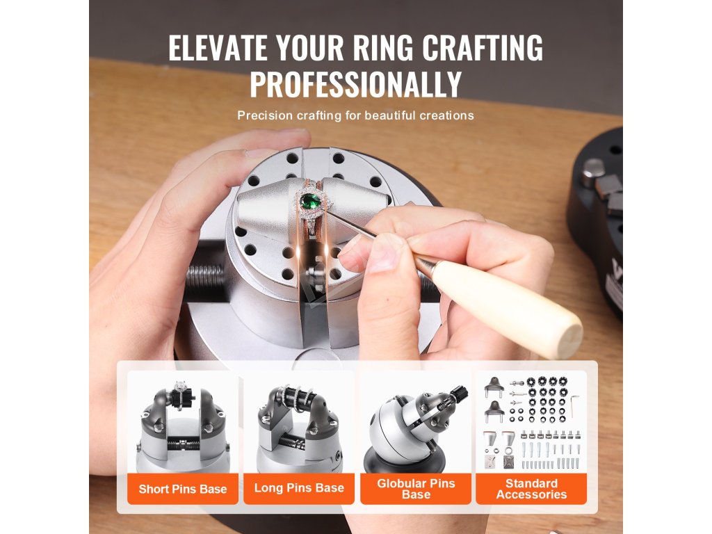 Gravírovací kulový svěrák obsahuje několik profesionálních doplňků, jako je krátká základna s kolíkem, dlouhá základna s kolíkem a základna s kulovým kolíkem. Toto příslušenství umožňuje snadné přizpůsobení různým velikostem a tvarům kroužků, což poskytuje větší flexibilitu a rozmanitost při práci.