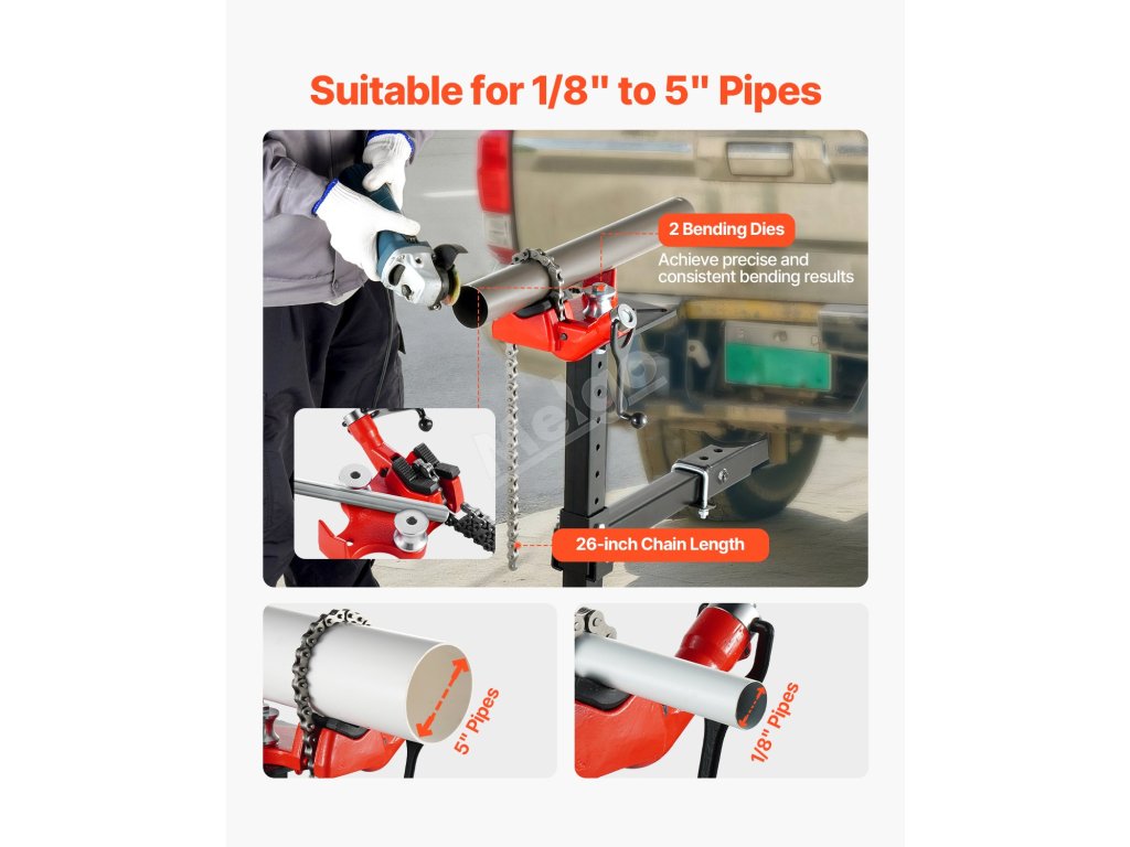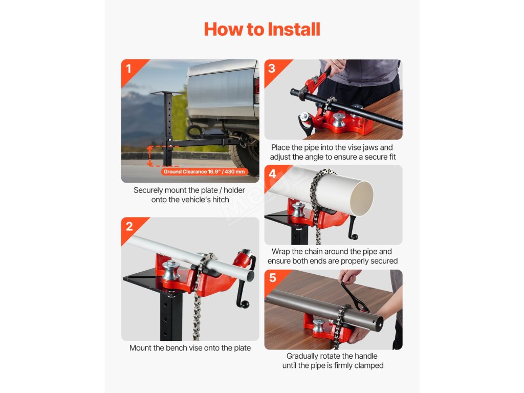 Řetězový svěrák na trubky a držák svěrákové desky se závěsem spolu dokonale spolupracují a splňují širokou škálu požadavků na zpracování trubek. Svěrák je vhodný pro trouby o průměru 1/8" až 5" a držák desky se závěsem nabízí nastavení výšky v 9 stupních, kompatibilní s přijímači 2 x 2 palce, což je ideální pro různé pracovní potřeby.