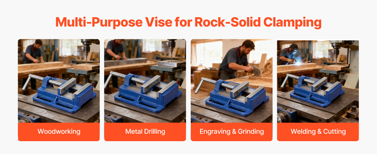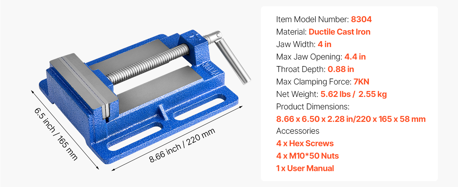 Tento vrtací svěrák je vyroben z vysoce pevné litiny a má dlouhé drážky pro snadnou instalaci a přemístění. Je navržen pro všestranné použití a hodí se k frézkám, vrtačkám a dalším strojům.
