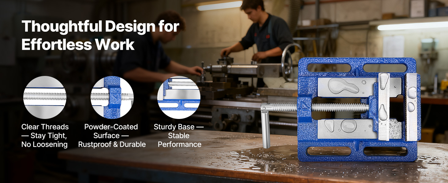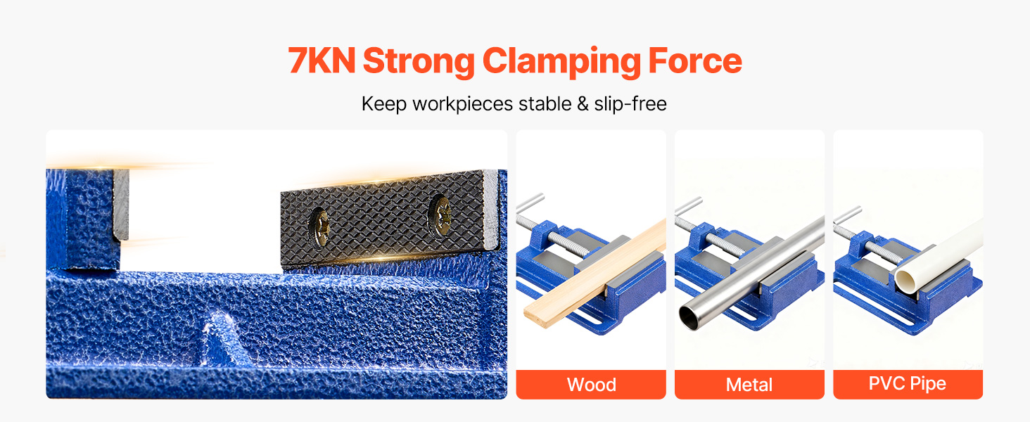 Náš litinový vrtací svěrák je vybaven průhlednými závity, které zůstávají pevné a odolné proti uvolnění, což zaručuje stabilní upnutí. Robustní základna zajišťuje stabilitu při práci a umožňuje bezpečnou a spolehlivou práci.