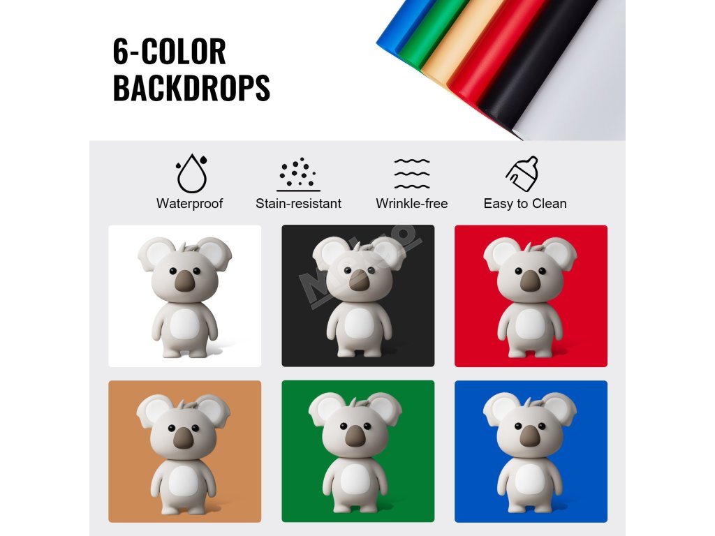 Zvyšte svou kreativitu pomocí 6 odnímatelných pozadí (černé/bílé/oranžové/červené/zelené/modré). Bez námahy vytvoříte různé efekty pozadí a tematické styly. Tato pozadí jsou vyrobena z voděodolného PP materiálu, snadno se čistí, vyměňují a nemačkají, čímž zvyšují efektivitu vaší práce.