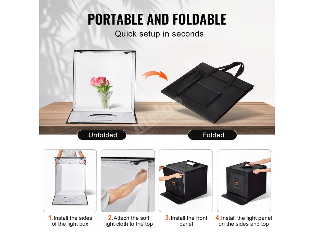 Užijte si maximální pohodlí s naším světelným boxem pro fotografická studia, který se snadno sbalí do kompaktní velikosti, která se pohodlně vejde do příručního zavazadla. Ideální pro fotografy na cestách, kteří jsou vždy připraveni pořídit úžasné snímky v jakémkoli prostředí.