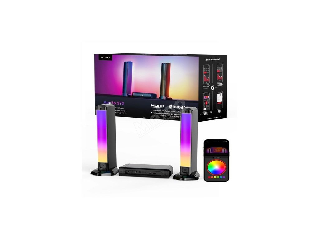 Podsvícený soundbar Ultimate Apollo S70 je všestranný díky své konfigurovatelné konstrukci, která umožňuje použití jako středový reproduktor, dva boční reproduktory nebo souvislý pás. Je vybaven světelnými efekty LED pro zvýšení vizuální přitažlivosti a lze jej namontovat na stěnu nebo použít jako volně stojící jednotku. Ovládání je jednoduché díky přiloženému infračervenému dálkovému ovladači a možnosti přizpůsobit nastavení prostřednictvím aplikace.