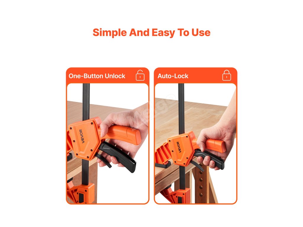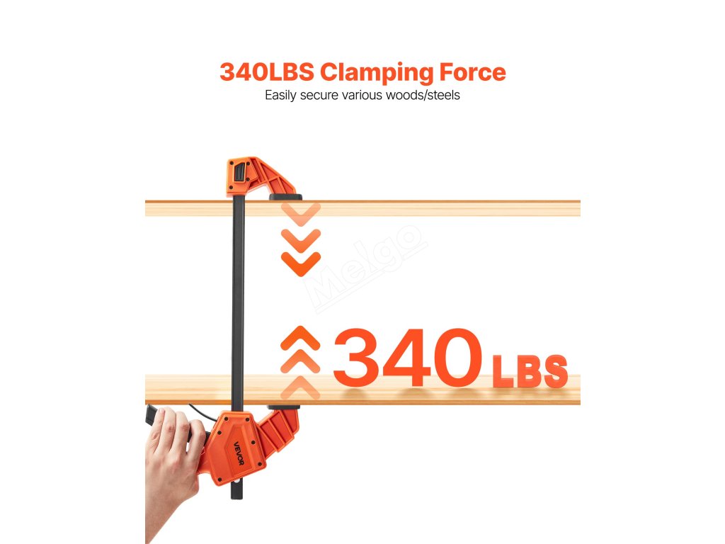 S robustní upínací silou 340 lbs se snadno vypořádáte s jakýmkoli úkolem při zpracování dřeva. Naše dřevoobráběcí svorky jsou bez námahy bezpečné pro řezání, spojování a montáž dřevěných výrobků, jako jsou stoly, židle, skříně a dokonce i ocelové materiály.