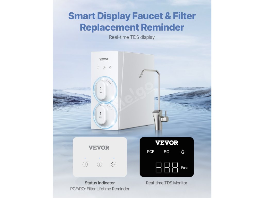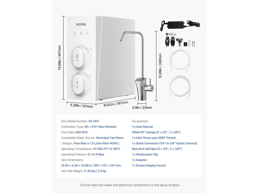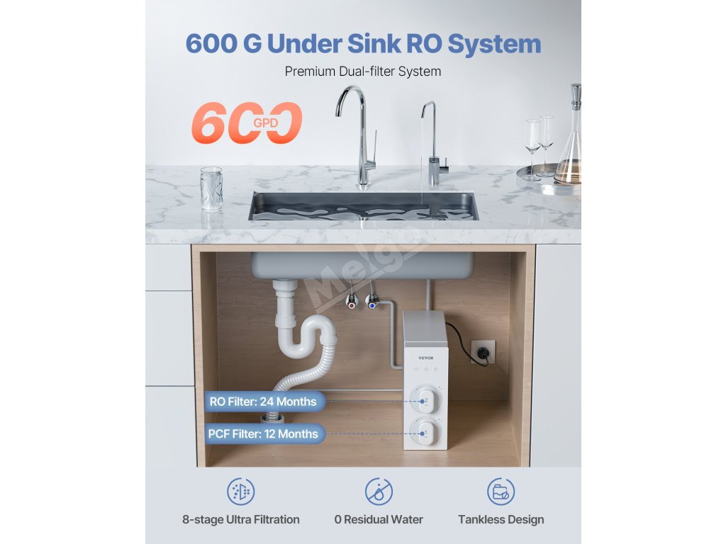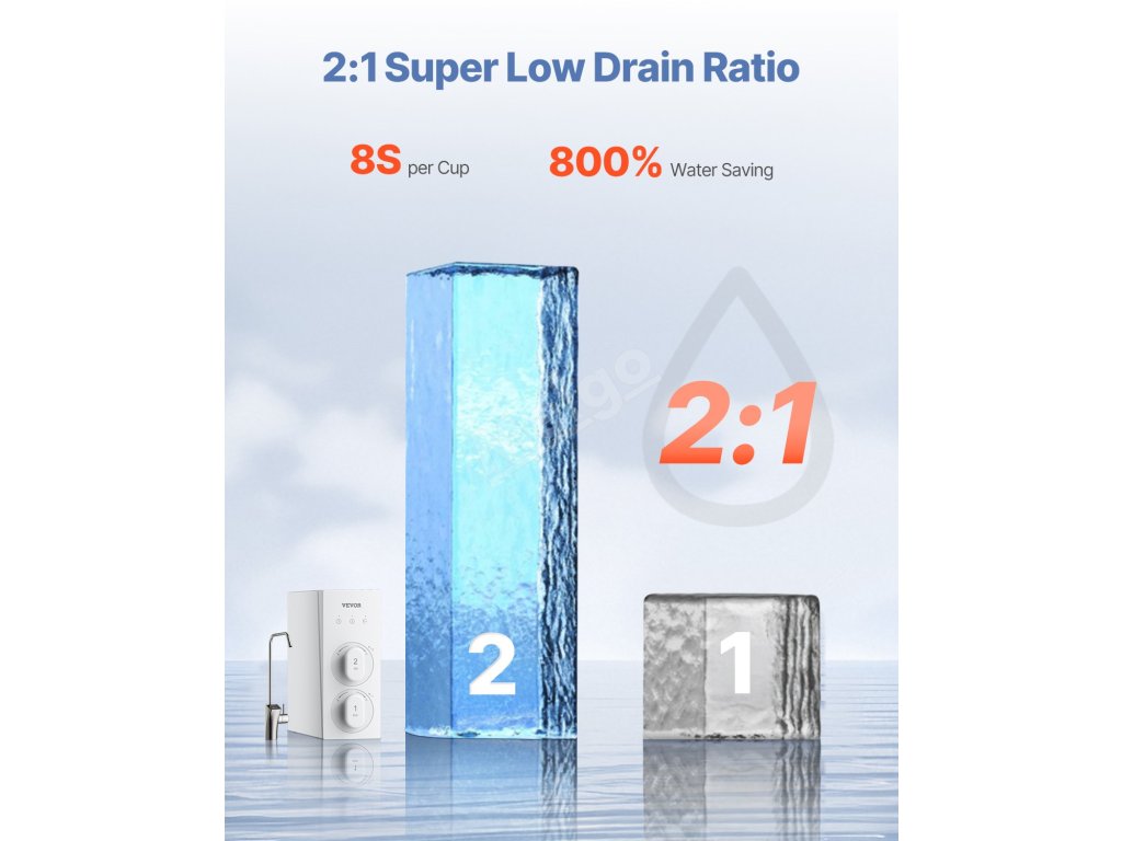 Vďaka pomeru čistej a odpadovej vody 2:1 tento beztlakový systém RO maximalizuje účinnosť vašej vody. Okrem toho jeho veľkorysá kapacita 600 GPD a prietok 1,5 l/min podporujú všetky vaše potreby, ako je umývanie ovocia, varenie a používanie spotrebičov.