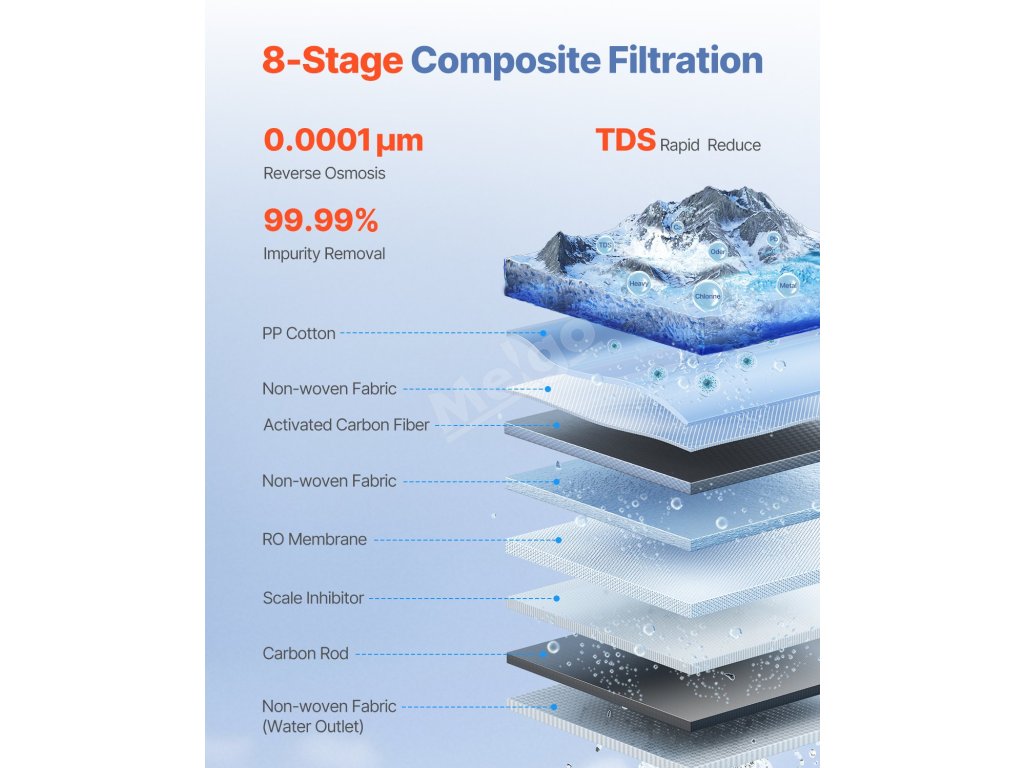 Náš beznádržkový systém reverznej osmózy, vybavený kompozitnými filtrami RO a PCF, poskytuje 8-stupňovú hĺbkovú filtráciu, ktorá účinne znižuje nečistoty a nepríjemné pachy a zároveň zlepšuje chuť každého dúšku.