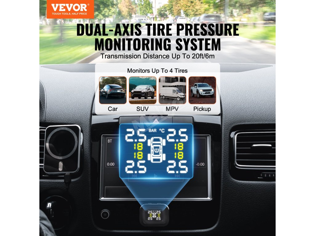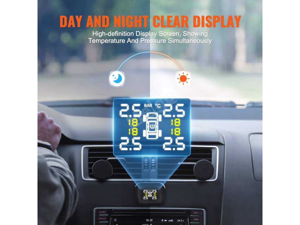 Tento systém monitorování tlaku v pneumatikách RV s displejem s vysokým rozlišením a citlivými monitorovacími senzory zajišťuje monitorování tlaku a teploty až 4 pneumatik v reálném čase s přesností +/-0,1 bar. Poskytuje jasné údaje za denního světla i ve tmě.