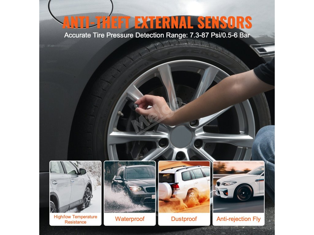 Díky extrémně dlouhé přenosové vzdálenosti je náš univerzální bezdrátový systém pneumatik vhodný pro osobní automobily, vozy SUV a další vozidla a poskytuje stabilní monitorování a nepřetržité spolehlivé údaje o pneumatikách.