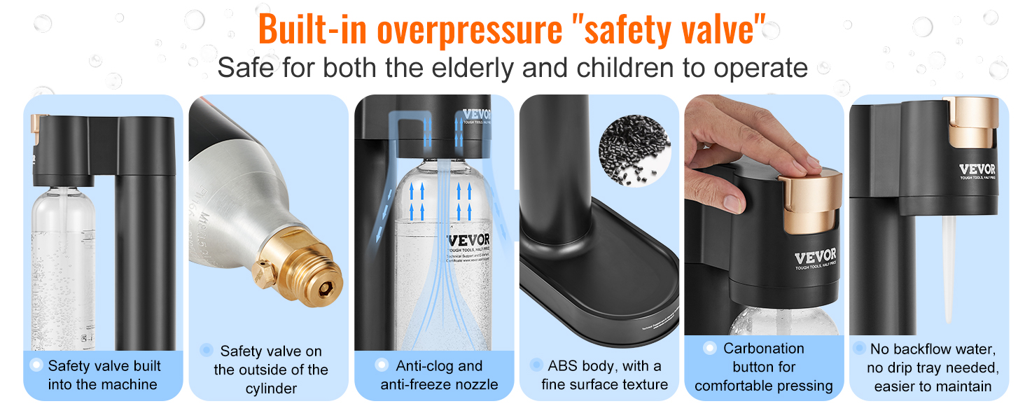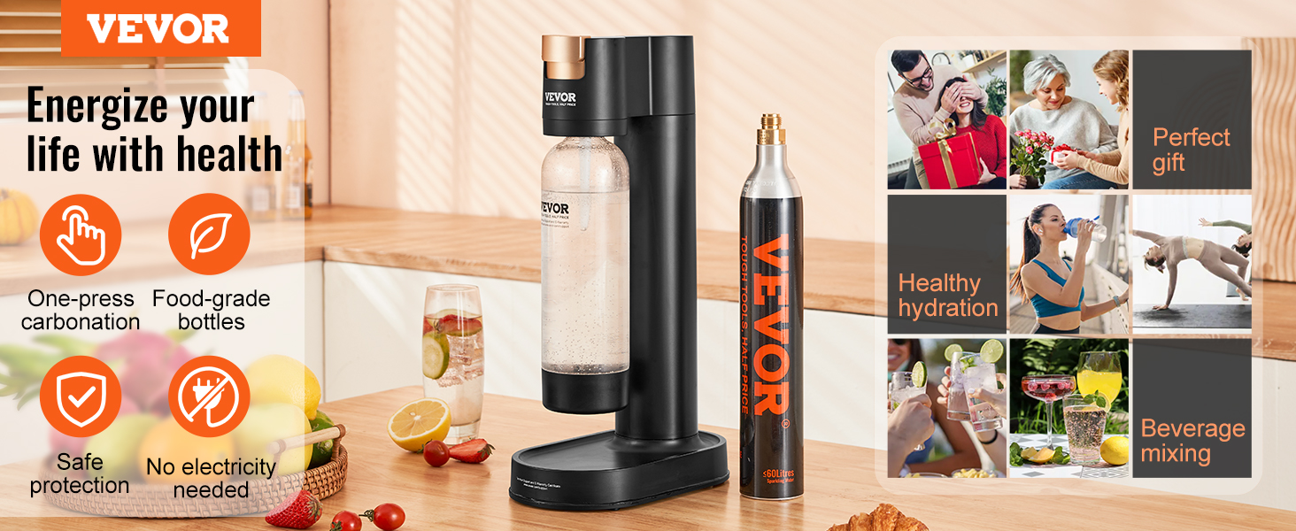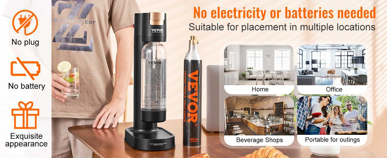 Vychutnejte si sklenici sodové vody během únavného pracovního dne a dopřejte si chutný, zdravý a osvěžující zážitek, aniž byste poškodili své zdraví. Neelektrické provedení se bez problémů integruje do domácností/kanceláří/výčepů nebo na přenosné cesty a zajistí, že vás bude provázet štěstí.