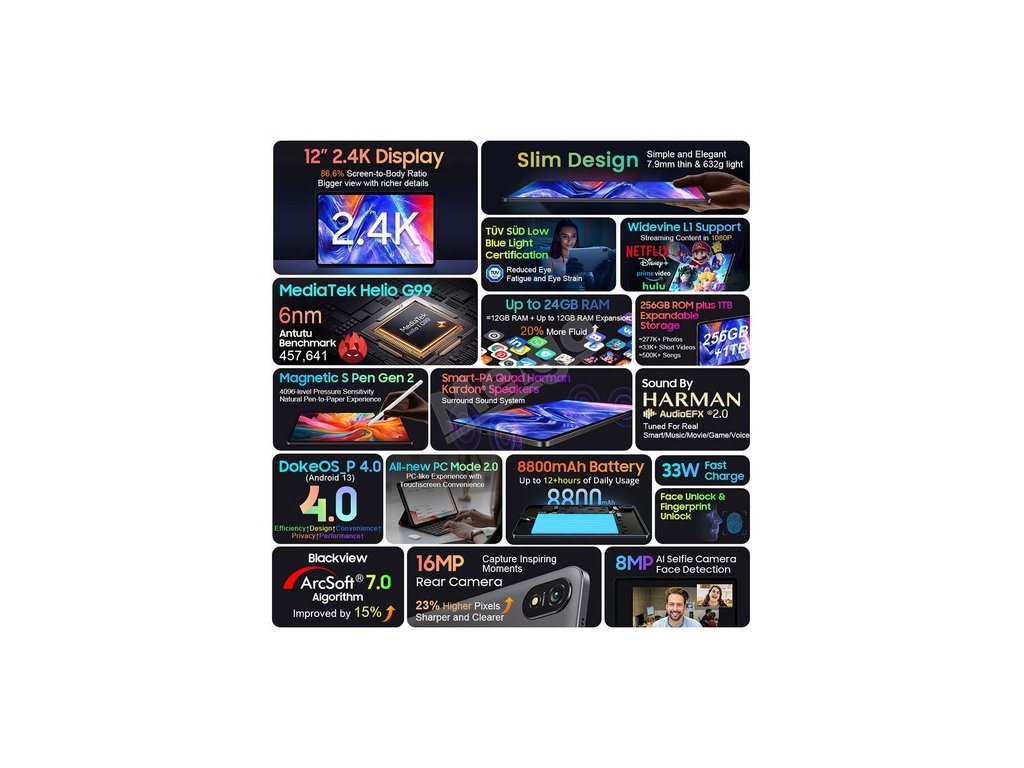 Tablet Blackview Tab 18 s působivou 12palcovou velkou obrazovkou se pyšní ohromujícím rozlišením 1200*2000 FHD+ a nabízí tak pohlcující vizuální zážitek jako nikdy předtím.