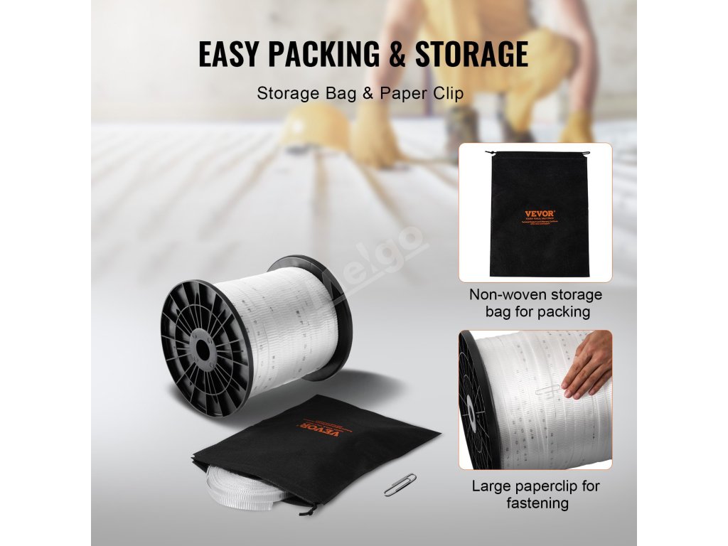 Postaráme se o vaše pohodlí! Polyesterová stahovací páska VEVOR je vybavena úložnou kapsou z netkané textilie pro snadnou organizaci použitých pásek a velkým uzávěrem ve tvaru přezky, který nepoužité pásky uchovává v bezpečí a přístupné.