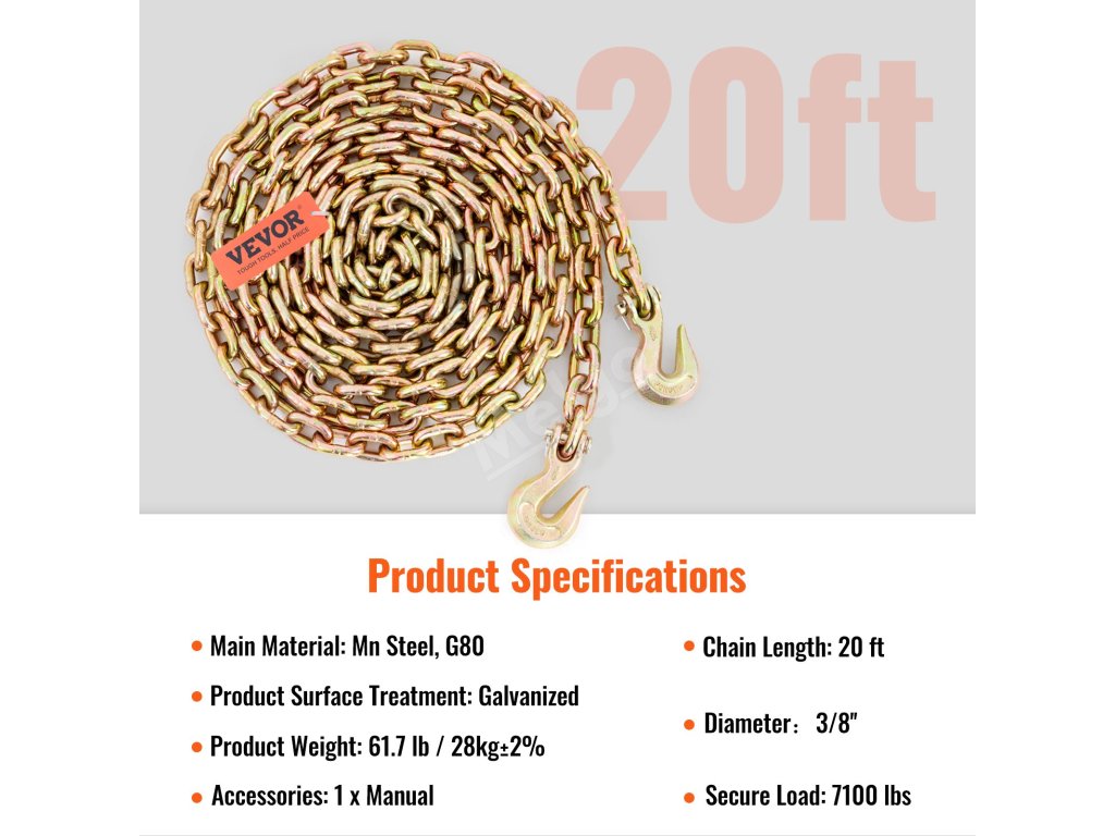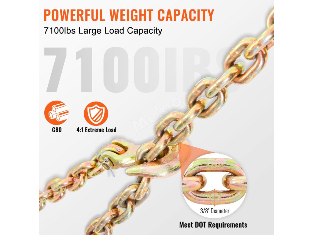 Vďaka limitnému pracovnému zaťaženiu 7100 lbs je táto reťaz ideálna na ťahanie a upevňovanie ťažkých zariadení, vďaka čomu zvládnete náročné úlohy. Táto reťaz je vyrobená z mangánovej ocele, je pevná a odolná. Zvládne časté používanie bez toho, aby sa pretrhla! Pozinkovaná povrchová úprava ju chráni pred hrdzou a opotrebovaním. To zaručuje dlhotrvajúci a spoľahlivý výkon. Táto reťaz vyniká pri profesionálnom aj osobnom použití. Či už potrebujete odtiahnuť vozidlo alebo zabezpečiť náklad, prácu zvládne. Vďaka svojej robustnej konštrukcii si vaša reťaz poradí aj s tými najnáročnejšími podmienkami. Či už potrebujete odtiahnuť neohrozené vozidlo alebo zabezpečiť náklad, svoju prácu zvládne. Naša prepravná reťaz na viazanie je spoľahlivá pre každého, kto potrebuje pevnú a odolnú reťaz. Používajte ju bez obáv na všetky svoje potreby pri ťahaní a zabezpečovaní.