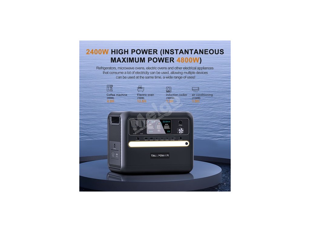Přenosný napájecí zdroj TALLPOWER V2400 má mimořádně velkou kapacitu 2160Wh a střídavý výkon 2400 W, takže jej lze použít nejen pro malé spotřebiče, ale i pro velké spotřebiče, jako jsou mikrovlnné trouby, bojlery, elektrické deky a autochladničky.