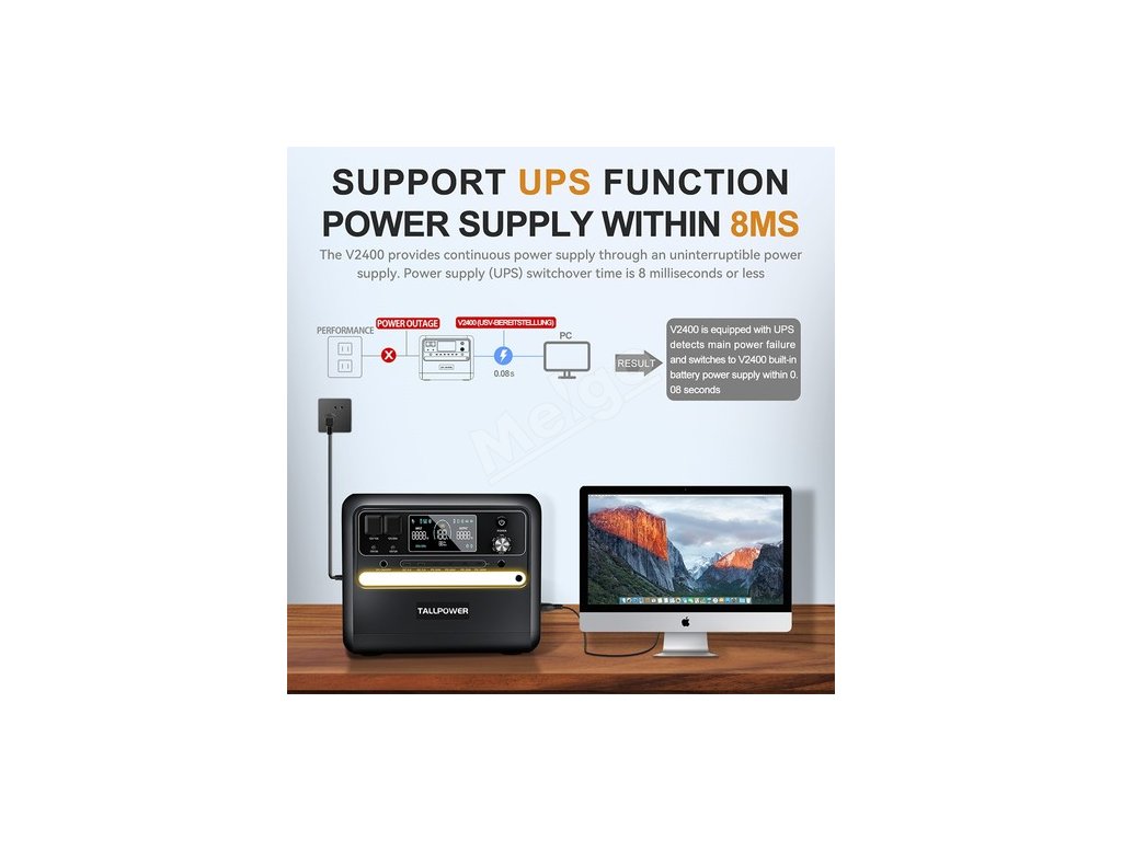 Oproti standardnímu přenosnému zdroji napájení je vybaven zdrojem nepřerušitelného napájení (UPS), který obvykle zajišťuje napájení zařízení připojených do zásuvky střídavého proudu. Když zjistí výpadek napájení, přepne se během 0,08 sekundy na napájení z vestavěné baterie V2400.