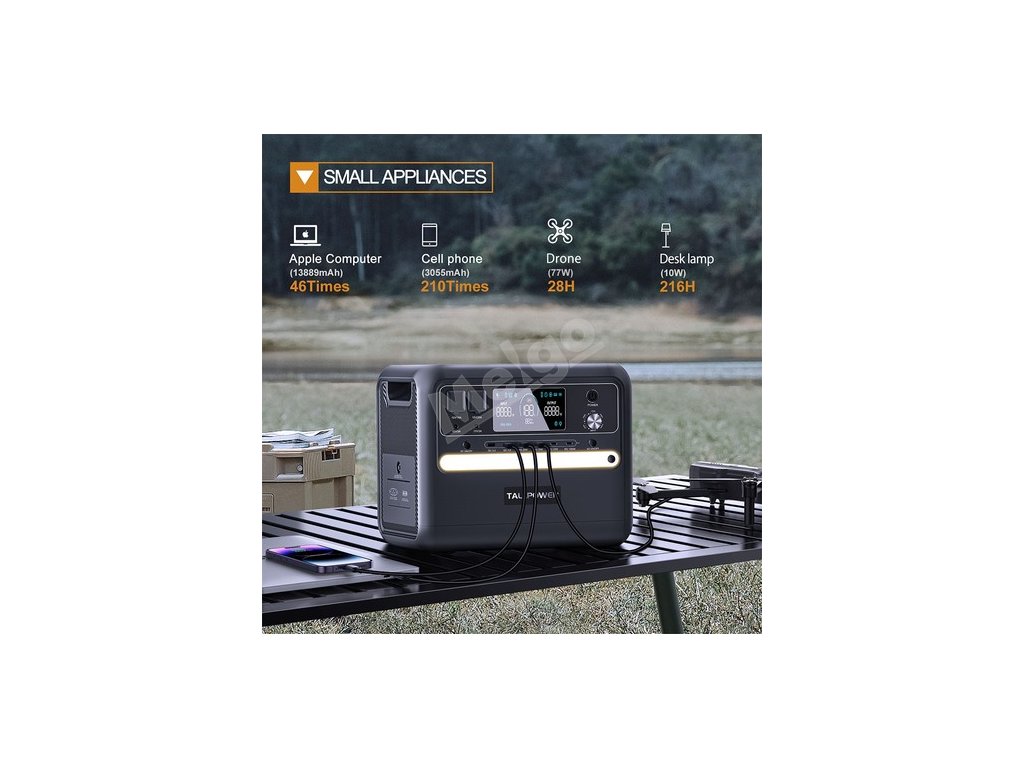 Přenosný napájecí zdroj TALLPOWER V2400 má mimořádně velkou kapacitu 2160 Wh a střídavý výkon 2400 W, takže jej lze použít nejen pro malé spotřebiče, ale i pro velké spotřebiče, jako jsou mikrovlnné trouby, bojlery, elektrické deky a autochladničky.