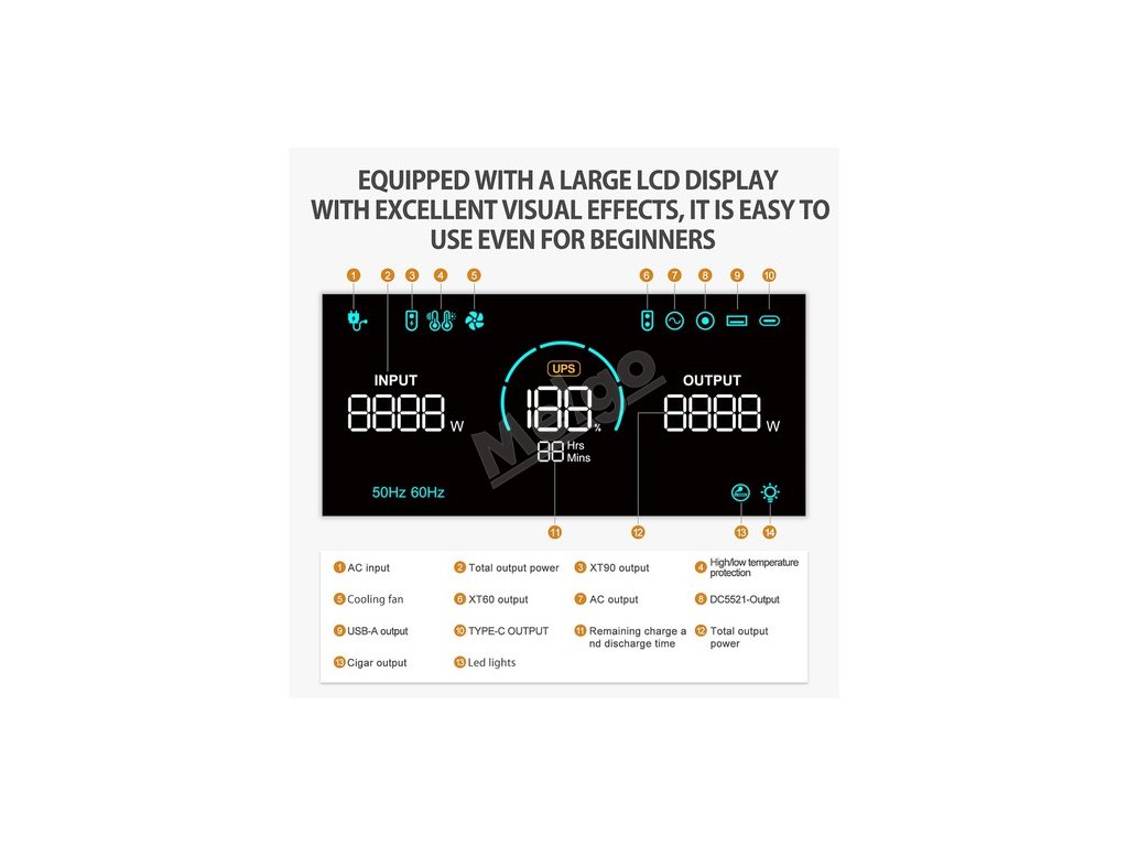 Přední část hlavní jednotky je vybavena velkým displejem LCD, který zobrazuje různé informace, jako je zbývající úroveň nabití baterie a vstupní/výstupní výkon a zbývající doba nabíjení a vybíjení, což usnadňuje kontrolu stavu používání. Jednoduchý design a snadno použitelná LED světla se skvěle hodí také pro osvětlení při kempování nebo nočním rybaření a lze je použít jako výstražné světlo v případě katastrofy.