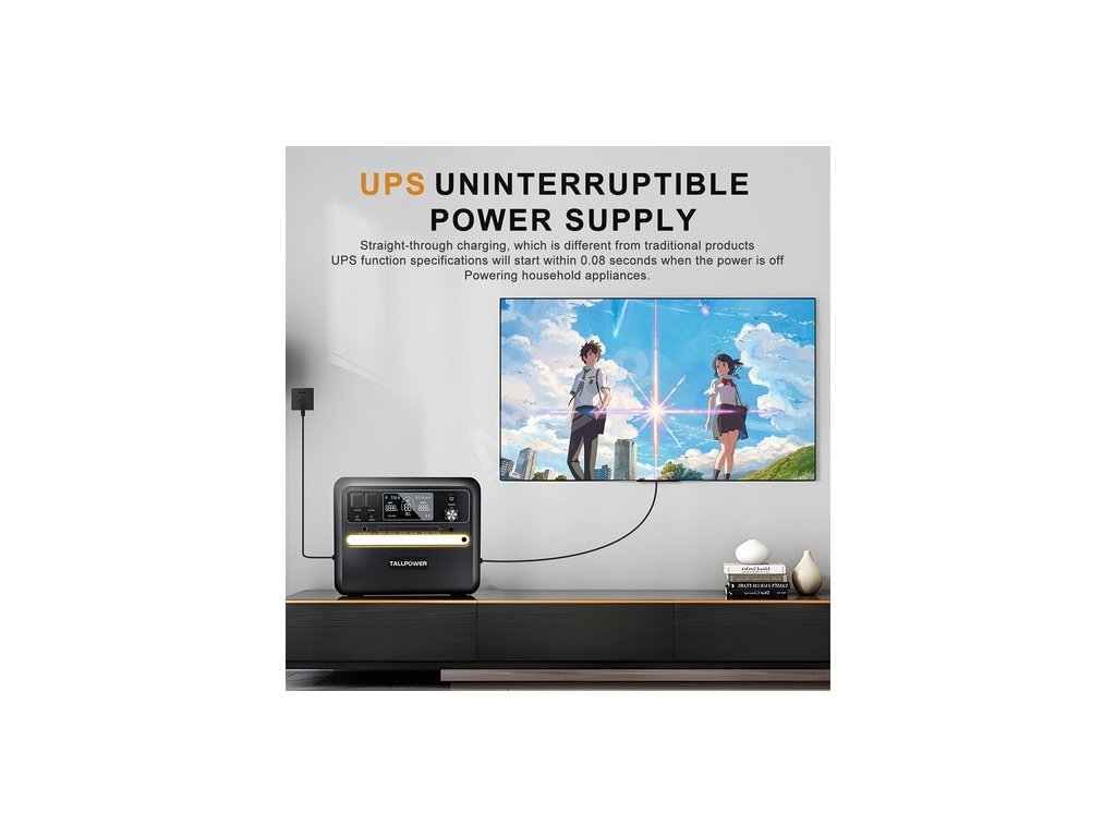 Přenosný napájecí zdroj TALLPOWER V2400 má mimořádně velkou kapacitu 2160Wh a střídavý výkon 2400 W, takže jej lze použít nejen pro malé spotřebiče, ale i pro velké spotřebiče, jako jsou mikrovlnné trouby, bojlery, elektrické deky a autochladničky.