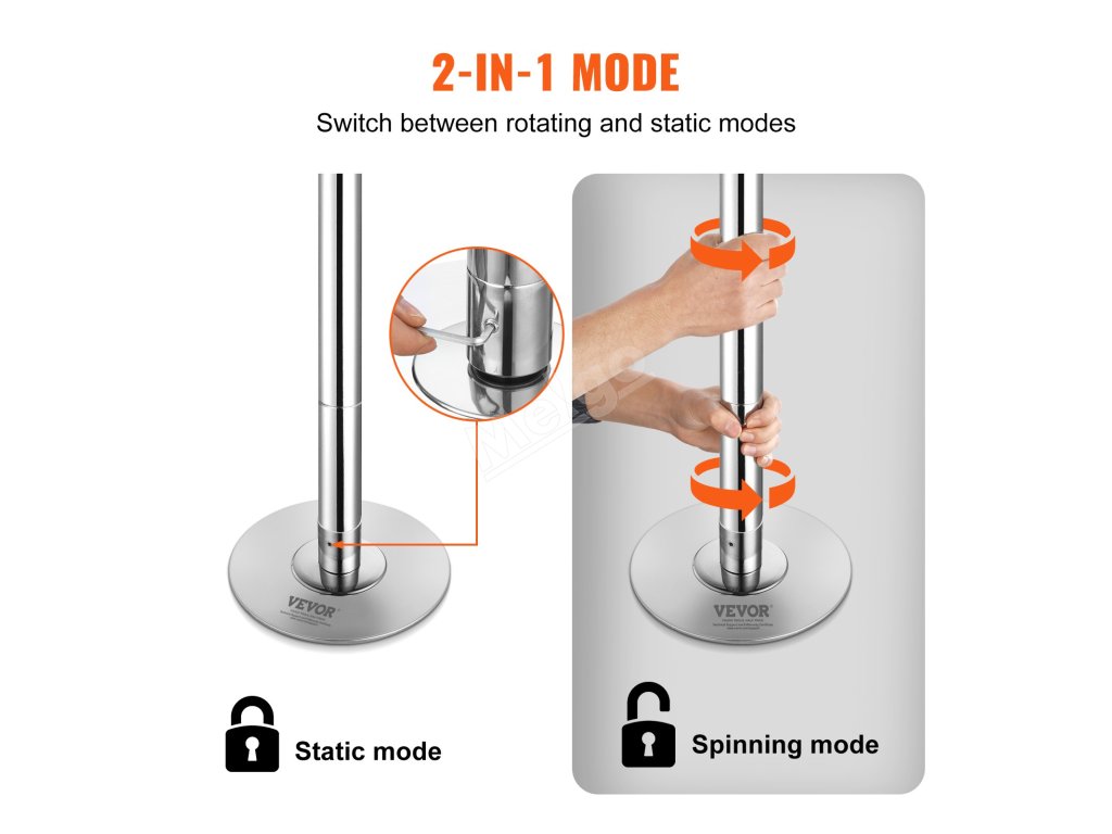 Konstrukce taneční tyče má dva režimy: rotační a statický. Ve statickém režimu stačí utáhnout spodní šroub k zajištění tyče, v rotačním režimu spodní šroub povolte.