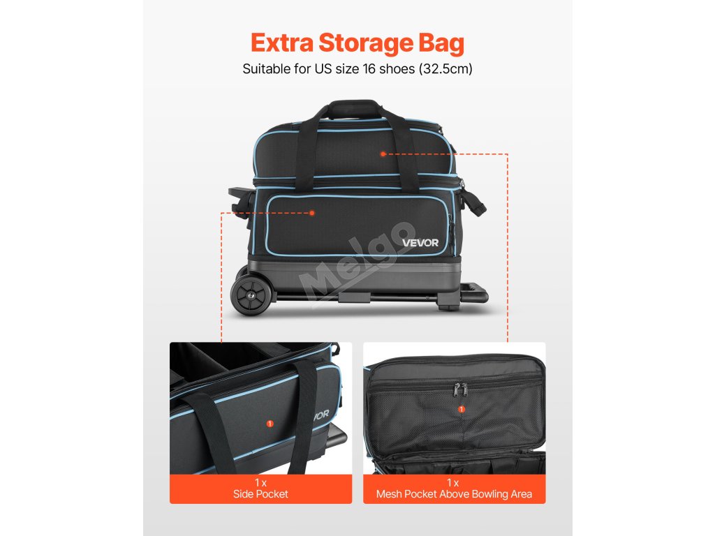 Naše bowlingová taška s kolečky pojme v hlavní přihrádce 2 standardní koule, zatímco do samostatné přihrádky na boty odolné proti vlhkosti se vejdou boty velikosti US 16. Horní síťovaná kapsa poskytuje rychlý přístup k ručníkům a vybavení, zatímco vnější boční kapsa uchová váš telefon a klíče, a to vše v jedné tašce.