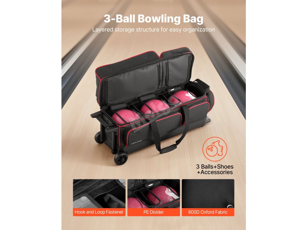 Naše bowlingová taška s kolečky pojme v hlavní přihrádce 3 standardní koule, zatímco do samostatné přihrádky na boty odolné proti vlhkosti se vejdou boty velikosti US 16. Horní síťovaná kapsa umožňuje rychlý přístup k ručníkům a vybavení, zatímco do vnější boční kapsy uložíte telefon a klíče.