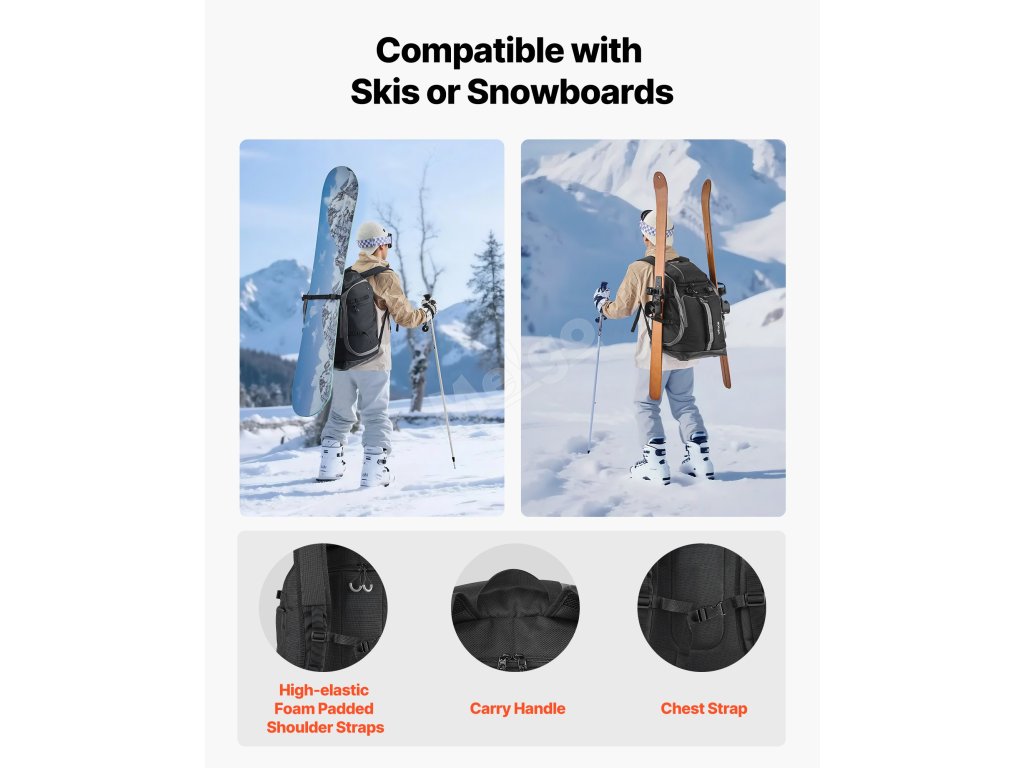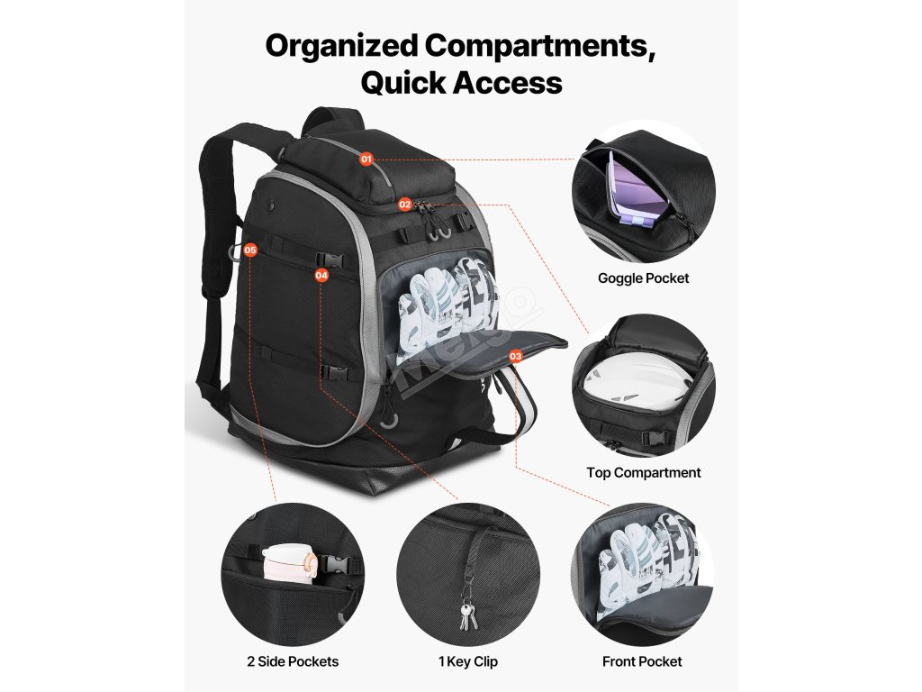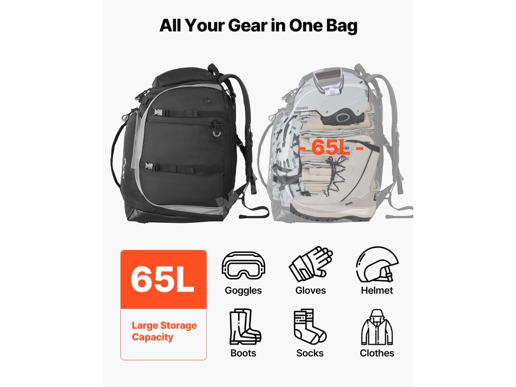Tento batoh na lyžařské boty je vhodný pro boty až do velikosti 14. Pojme váš snowboard nebo lyže a poskytuje vyhrazený prostor pro brýle, helmu a další vybavení.