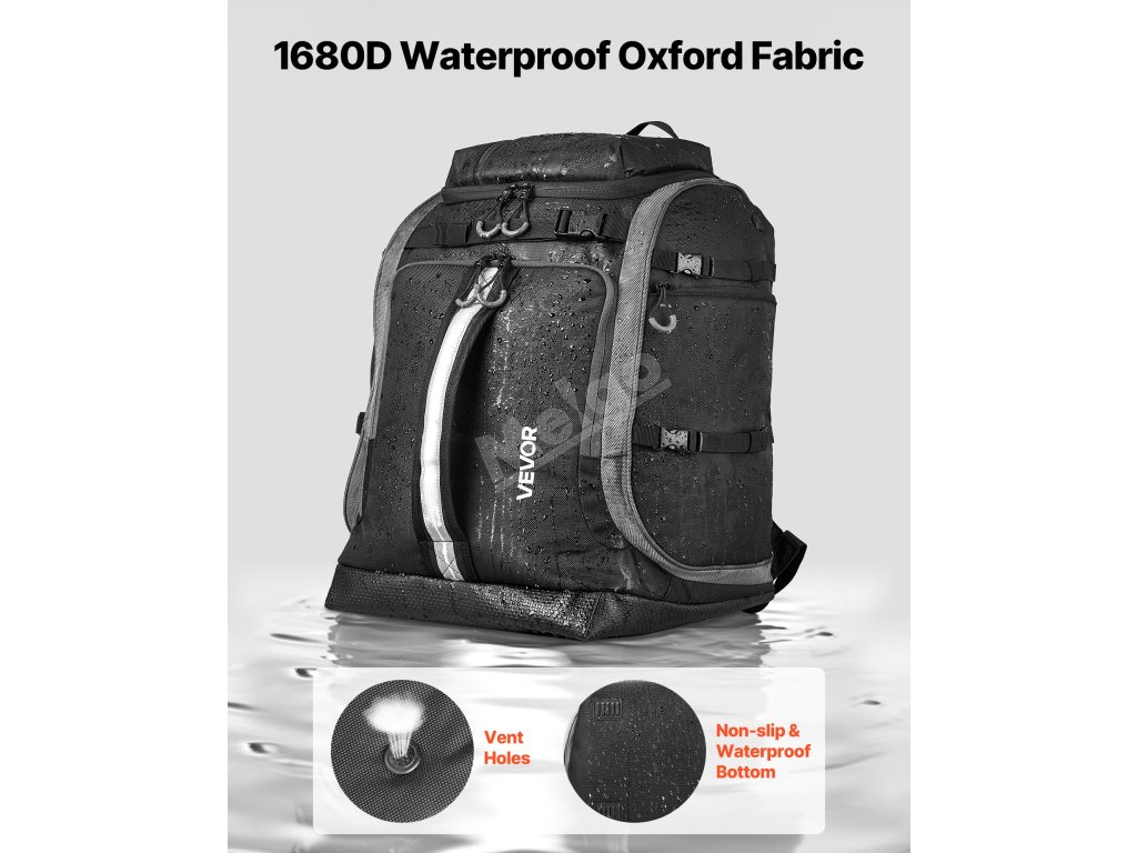 Tento vak na snowboardové boty je vyroben z vysoce odolné nepromokavé tkaniny 1680D Oxford s nepromokavou podšívkou a dnem a účinně blokuje sníh a déšť, aby vaše vybavení zůstalo v suchu a bylo chráněno před vlhkostí a korozí. Větrací otvory ve spodní části zajišťují proudění vzduchu a zabraňují vzniku zápachu.