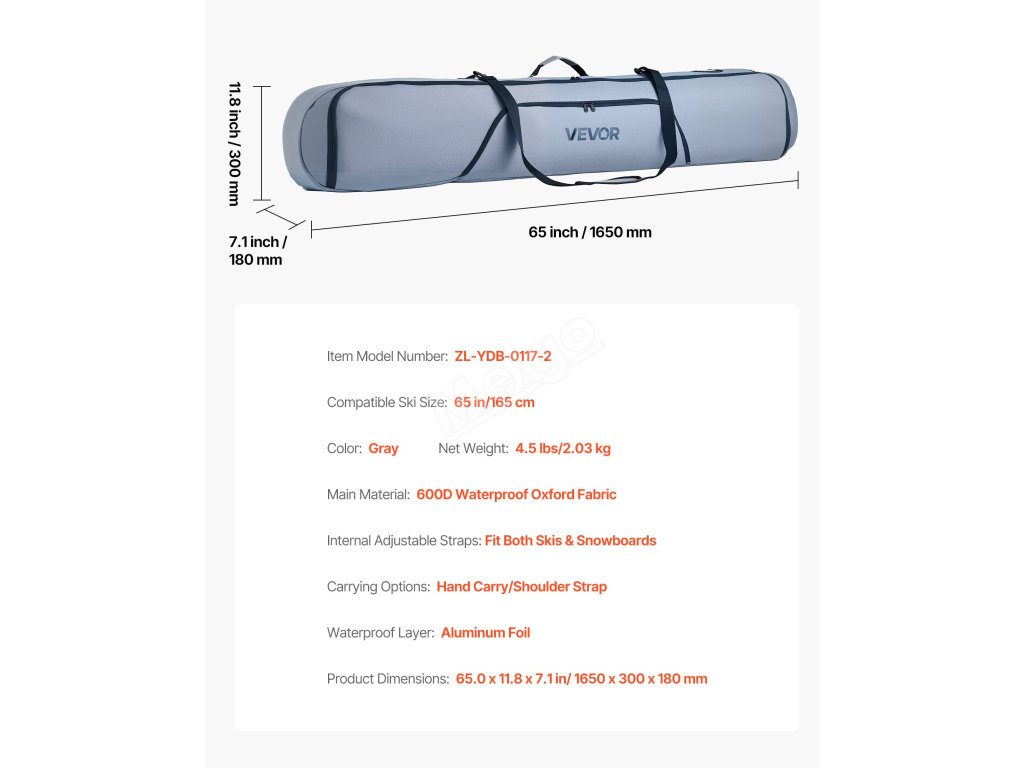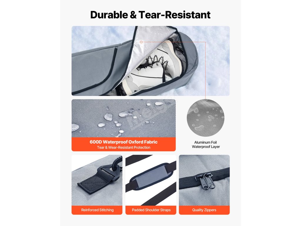 Tento vak na snowboard pro cestování letadlem je vyroben z lehké nepromokavé tkaniny 600D Oxford s ochrannou podšívkou a zabraňuje pronikání sněhu a deště, chrání vaše vybavení před vlhkostí a rzí a zároveň usnadňuje přenášení.