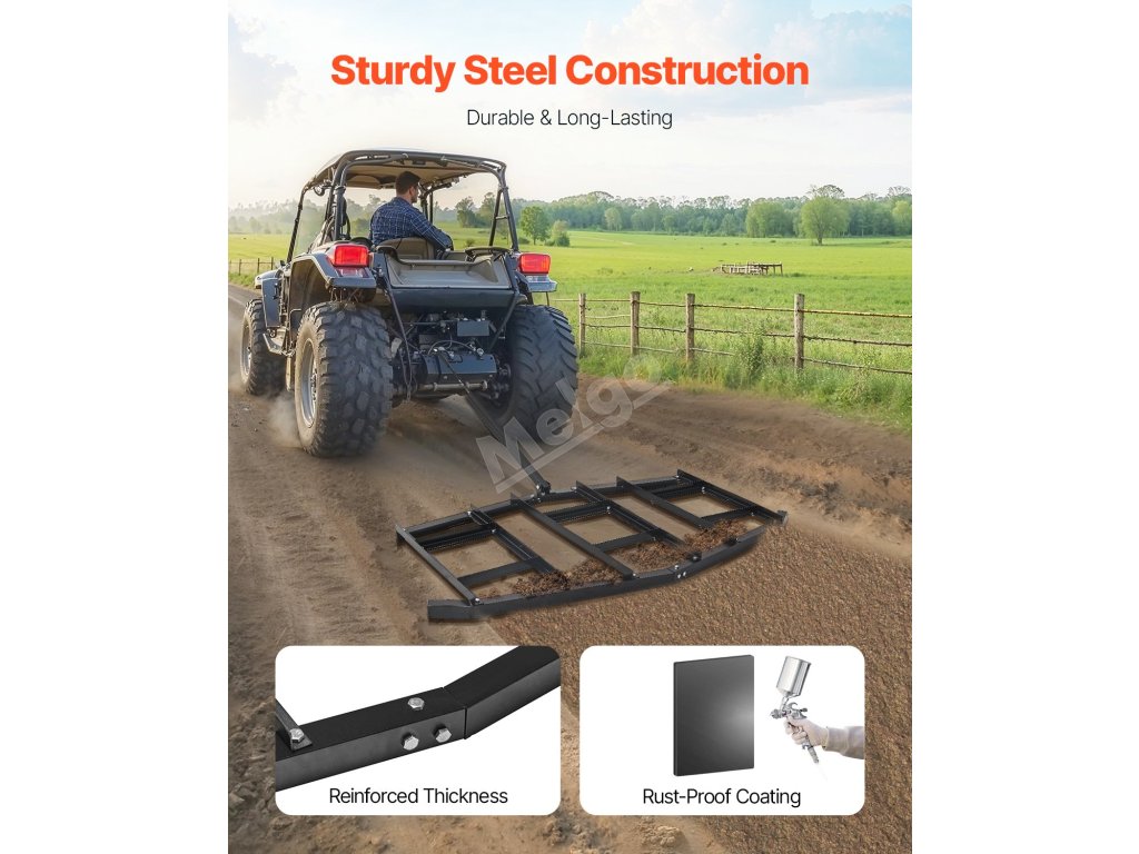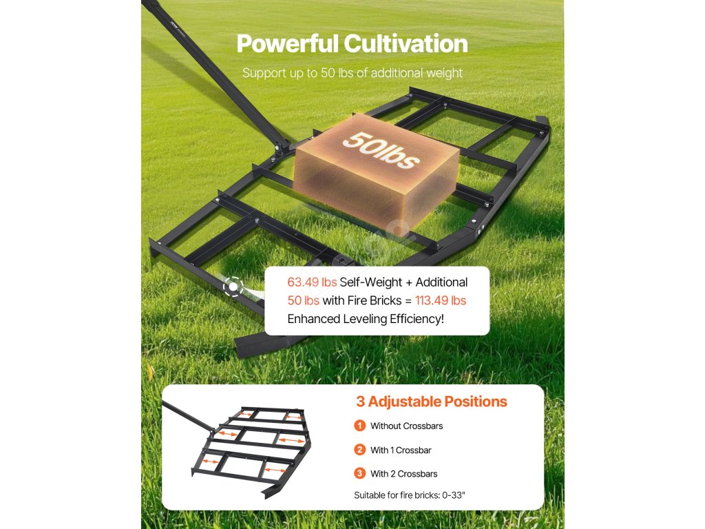 Díky dodatečné nosnosti 50 kg se tento tažený zadní hrablo hluboko vyrovná. Jeho nastavitelná šířka 0-33 palců vám umožní umístit cihly různých velikostí a s celkovou hmotností 63 liber plus šamotové cihly každý tah účinně srovná půdu a vytvoří pevný základ pro vaše pole.