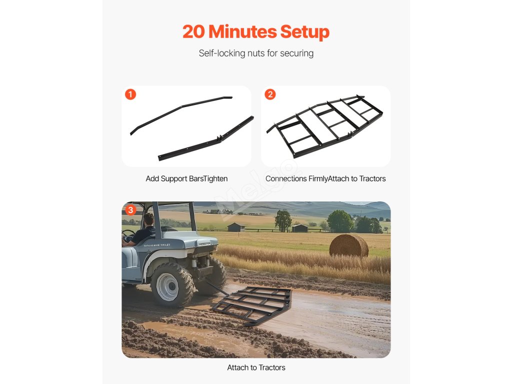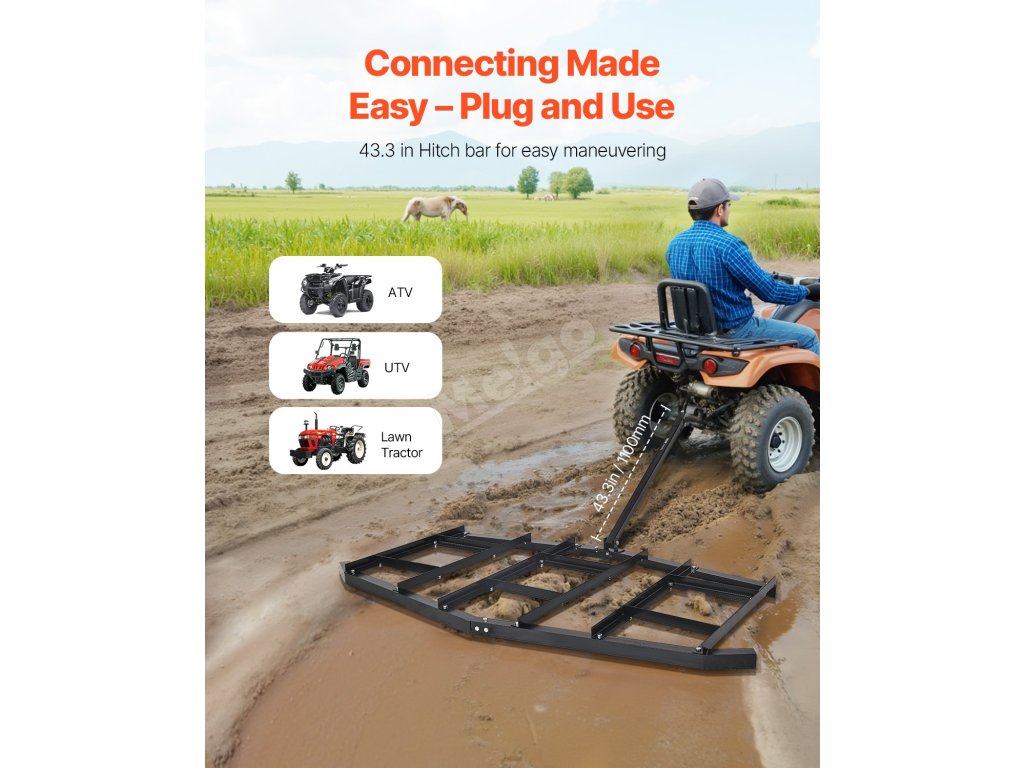 Táhlo umožňuje plynulé a snadné otáčení. Díky šířce závěsu 1,77 palce je tato tažná brána kompatibilní se čtyřkolkami, UTV, zahradními traktory a dalšími vozidly - není třeba žádné další nářadí. Připevňuje se rychle a poskytuje vynikající pracovní komfort.