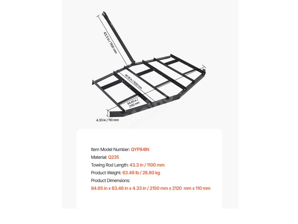 Tažné hrablo 84" šířka, q235 ocel, nastavitelné tyče, čepový závěs