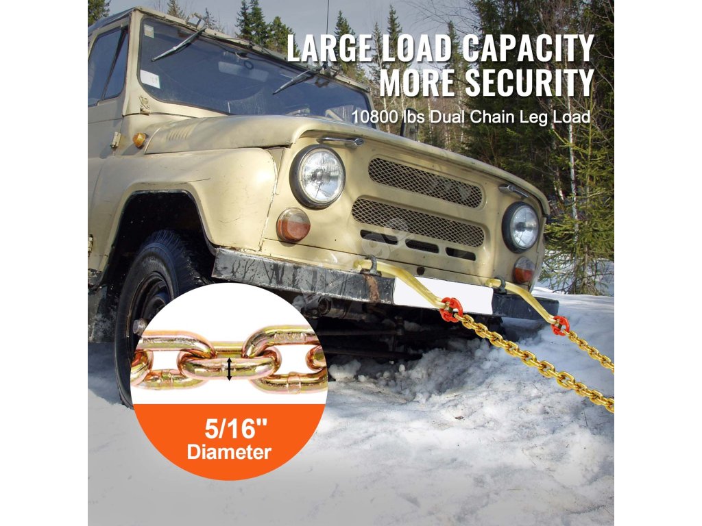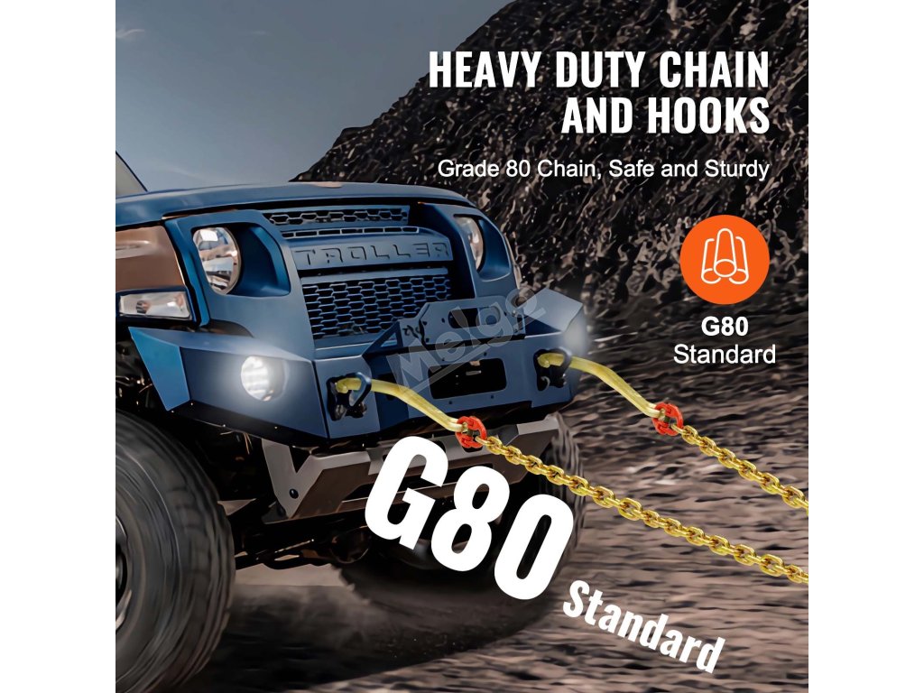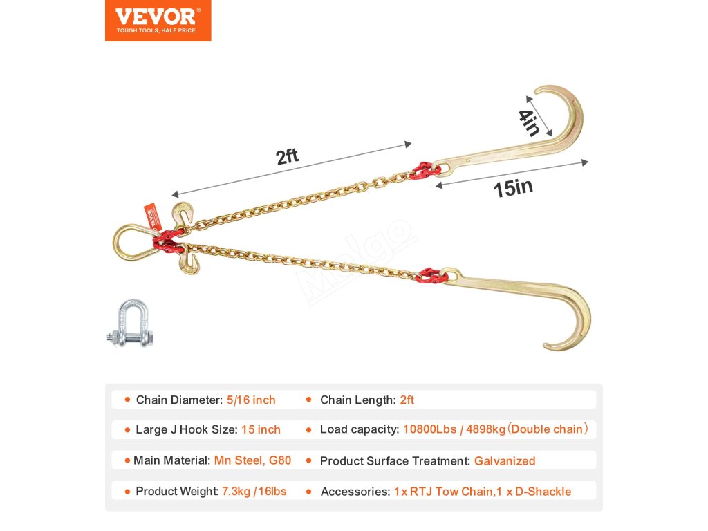VEVOR, váš exkluzivní odborník na nářadí. Tento řetěz s uzdečkou ve tvaru V je vyroben z vysoce kvalitní oceli s celkovou pevností 80. stupně. Je také vybaven háky pro uchycení na různé typy vozidel.
