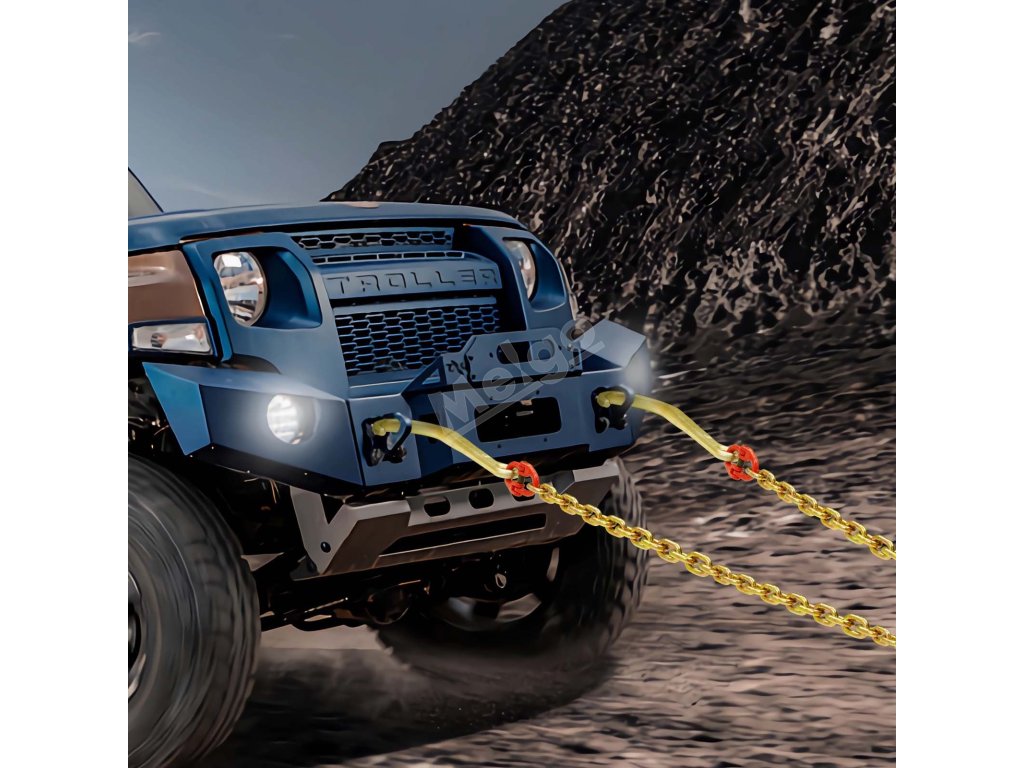 Tento vlečný řetěz s uzdečkou obsahuje několik háčků pro připevnění řetězu k různým typům vozidel.