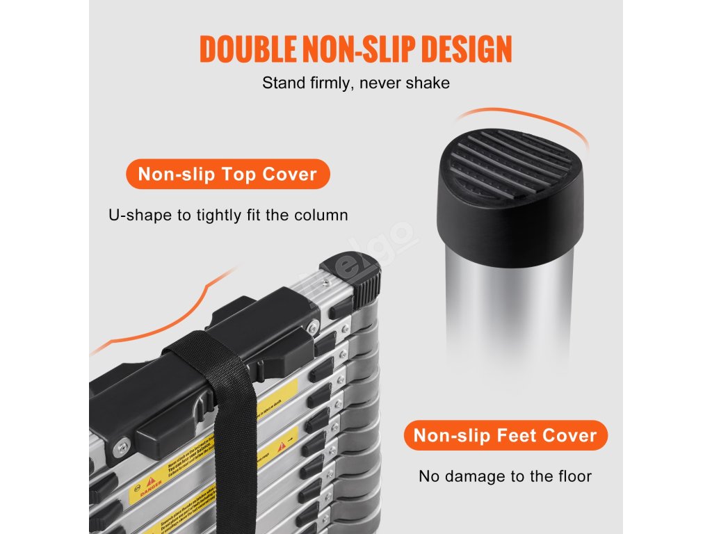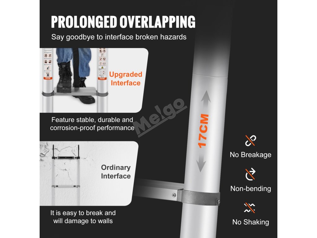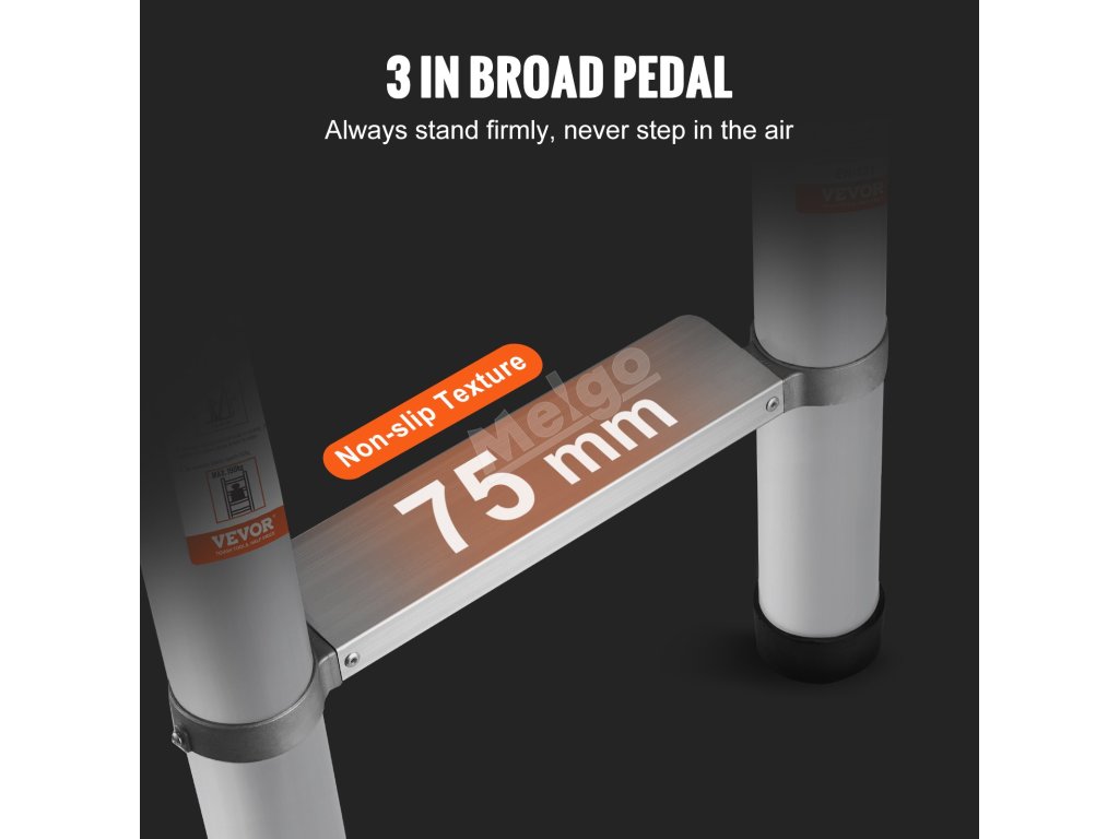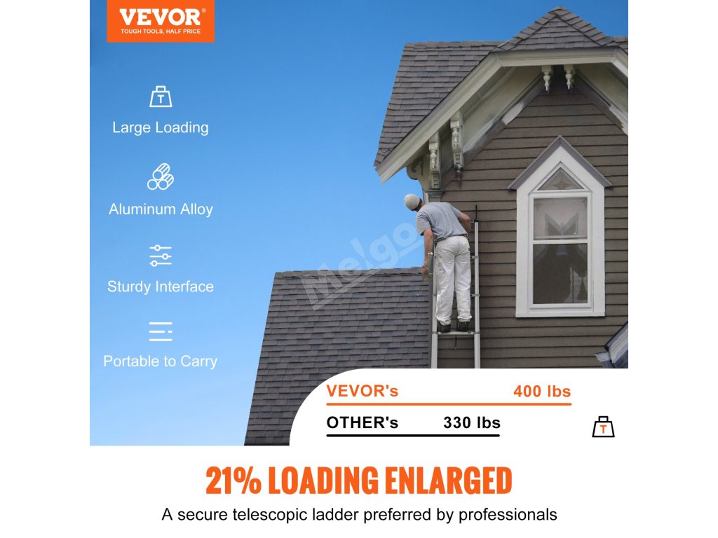 Oproti tradičním modelům jsme zvýšili nosnost žebříku na vysokých 400 liber. Žebřík má trubky a rozhraní stupňů z celohliníkové slitiny a také podlouhlé a překrývající se hliníkové trubky, které vám poskytnou větší bezpečnost a ochranu.