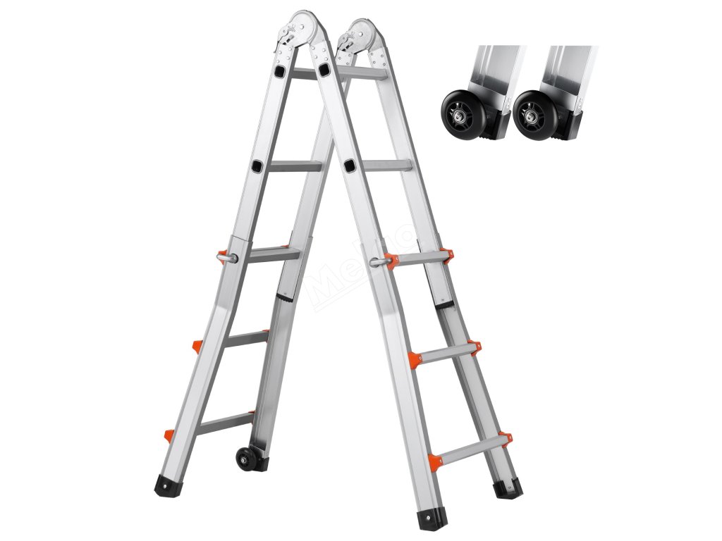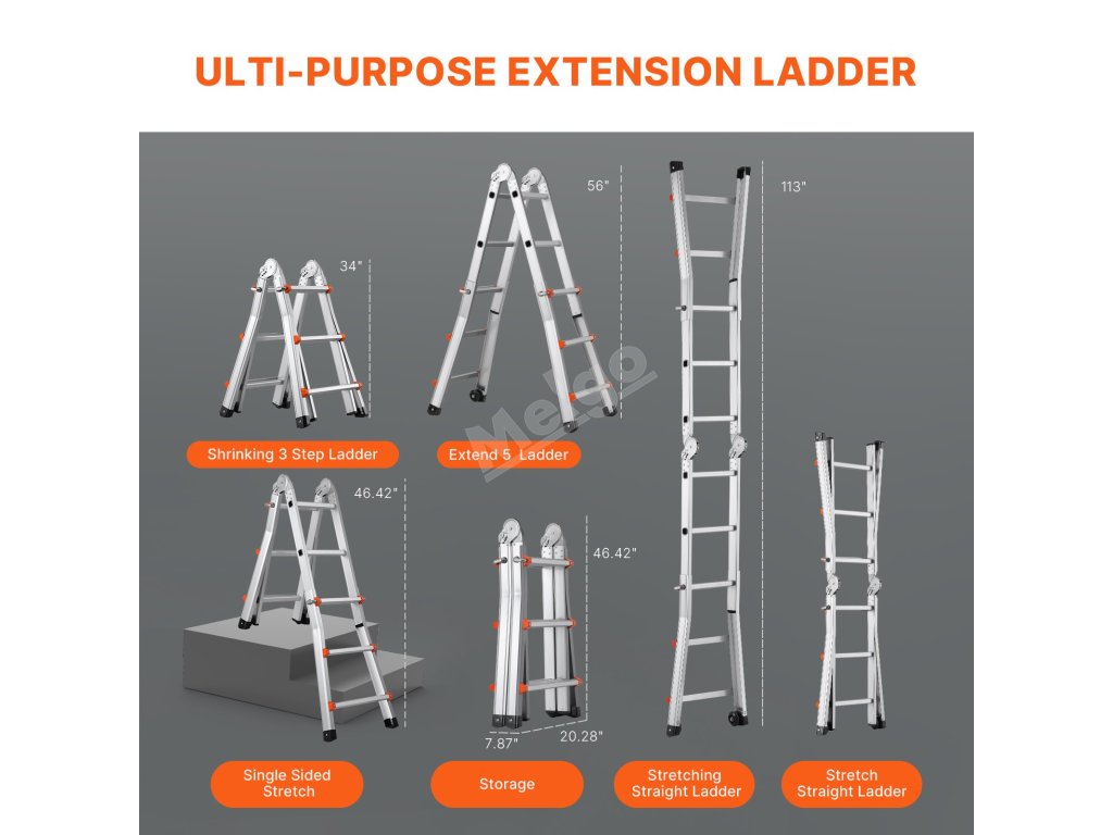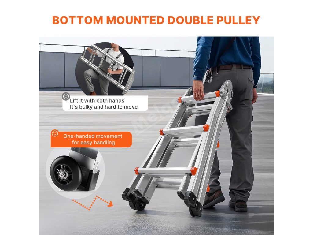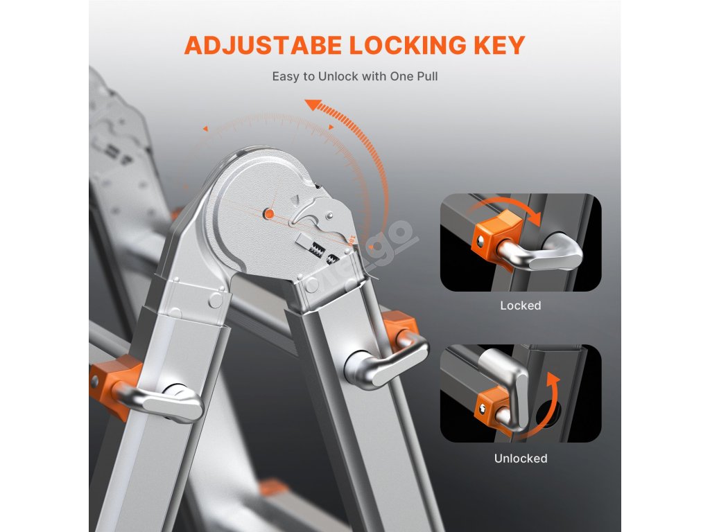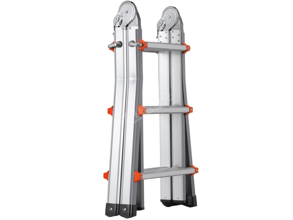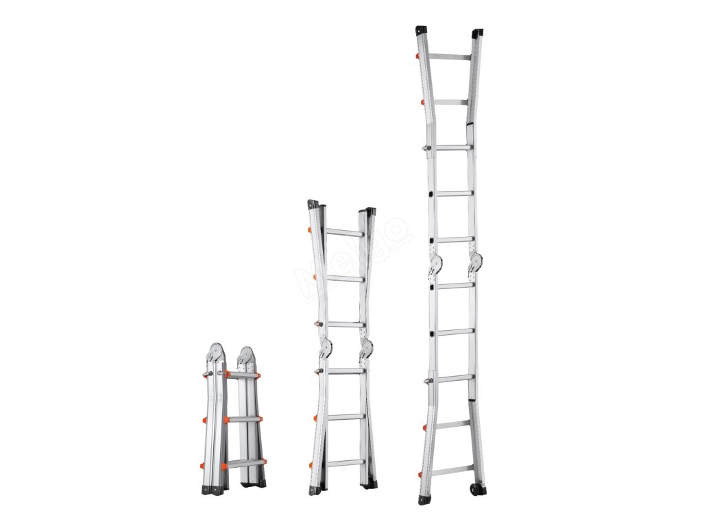 Tento multifunkčný výsuvný rebrík s rámom A má jedinečnú konštrukciu závesu, ktorá umožňuje jednoduché prepínanie medzi tromi uhlami: 35°, 107° a 180°, ktoré spĺňajú rôzne výškové požiadavky.