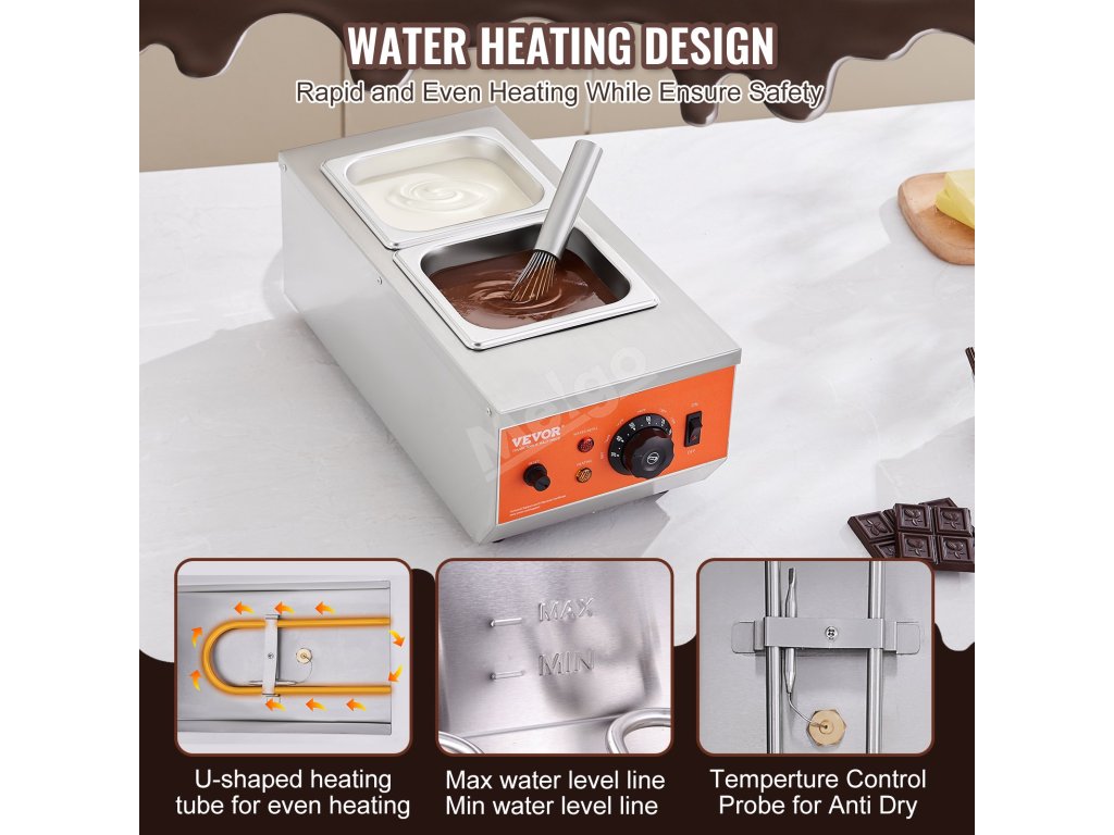 Vnitřek tohoto hrnce na rozpouštění čokolády se skládá z topné trubice ve tvaru písmene U a ohřívače ve vodní lázni, který zabraňuje přilepení čokolády ke dnu. Zajišťuje rovnoměrný ohřev čokolády, lepší tekutost směsi a hladší omáčky.