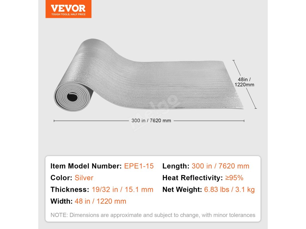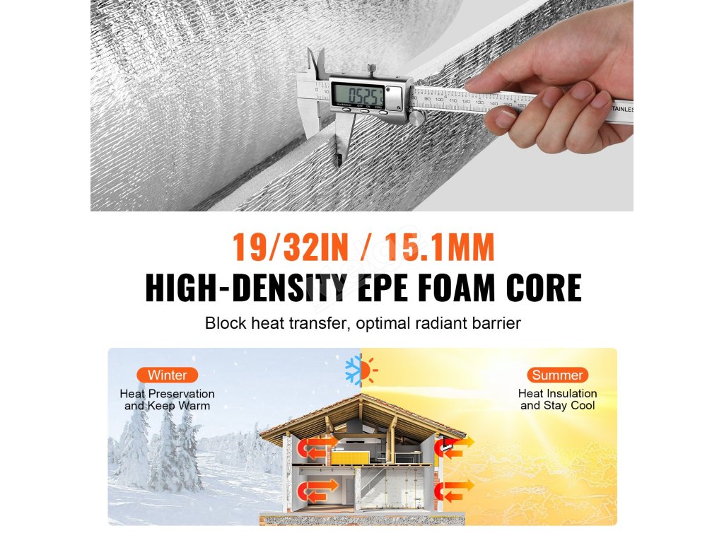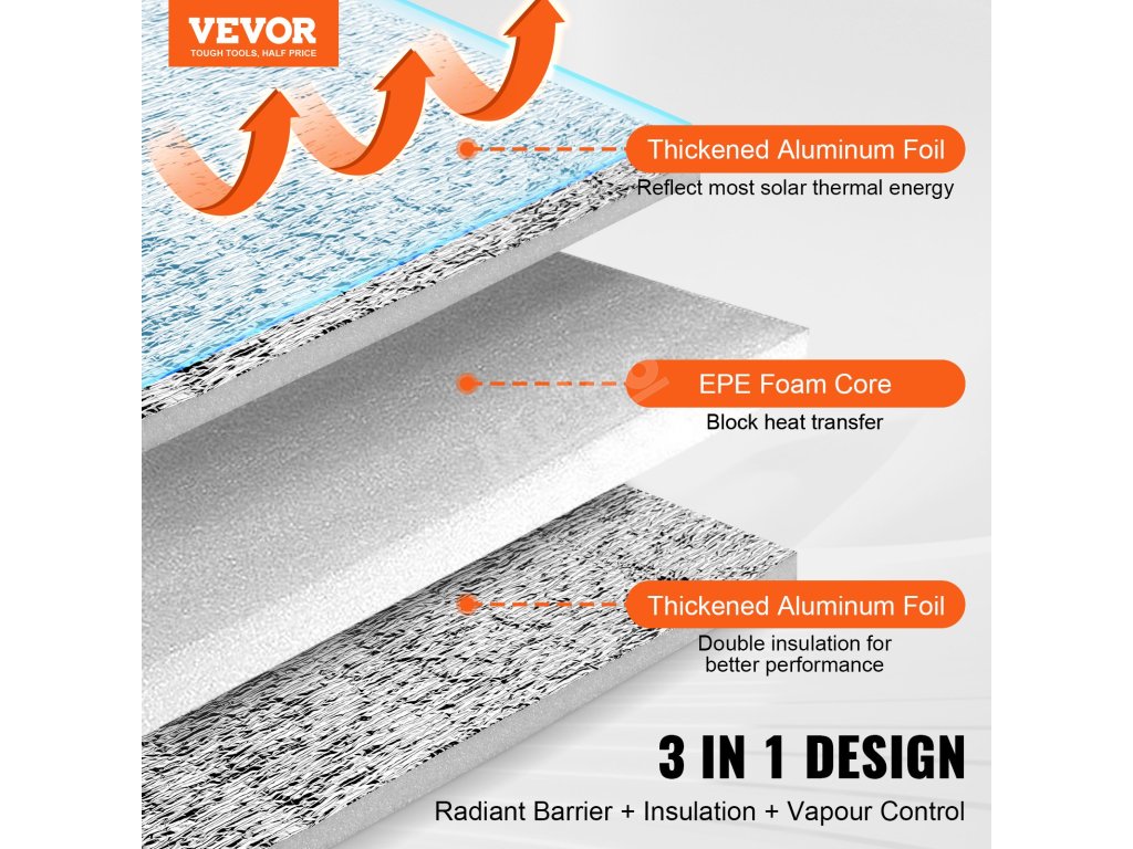 Dvojitá reflexní izolační role VEVOR má ≥ 95 % vysokou odrazivost pomocí dvojité reflexní hliníkové fólie a jádra z pěny EPE s vysokou hustotou. V létě účinně blokuje sluneční záření a v zimě zabraňuje tepelným ztrátám v interiéru, čímž udržuje příjemnou vnitřní teplotu.