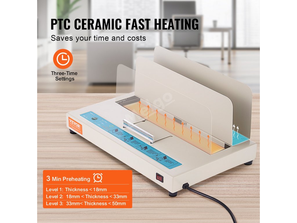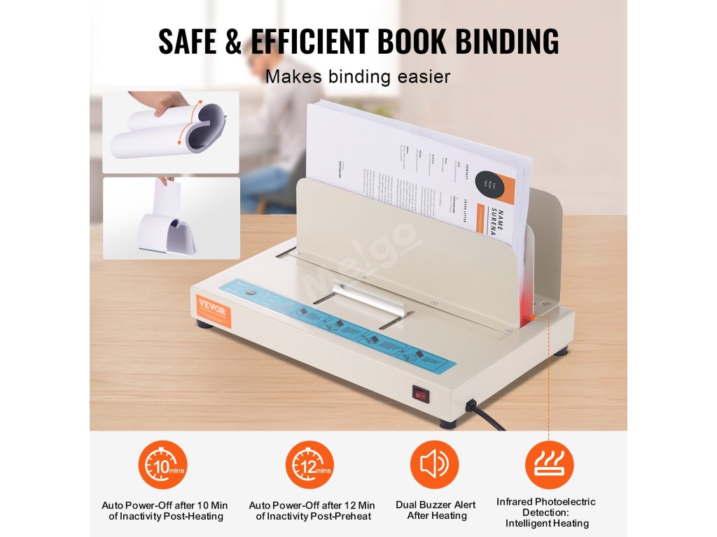 Náš termální vazač knih se automaticky vypne po 10 minutách nečinnosti a 12 minutách po předehřátí, což zajišťuje bezpečné používání.