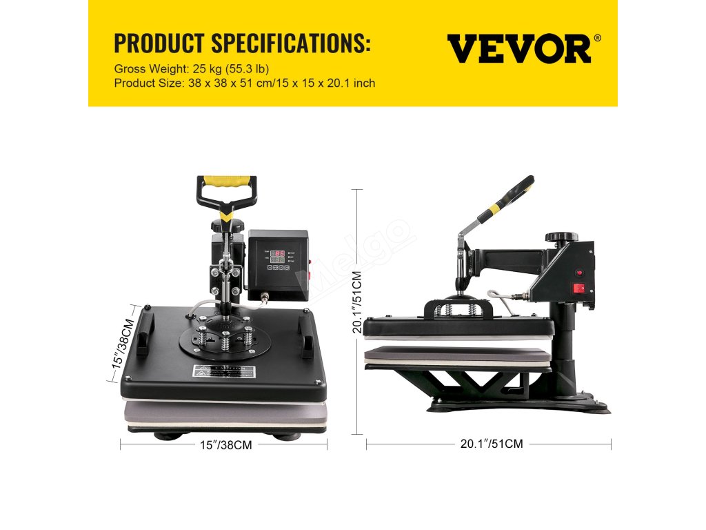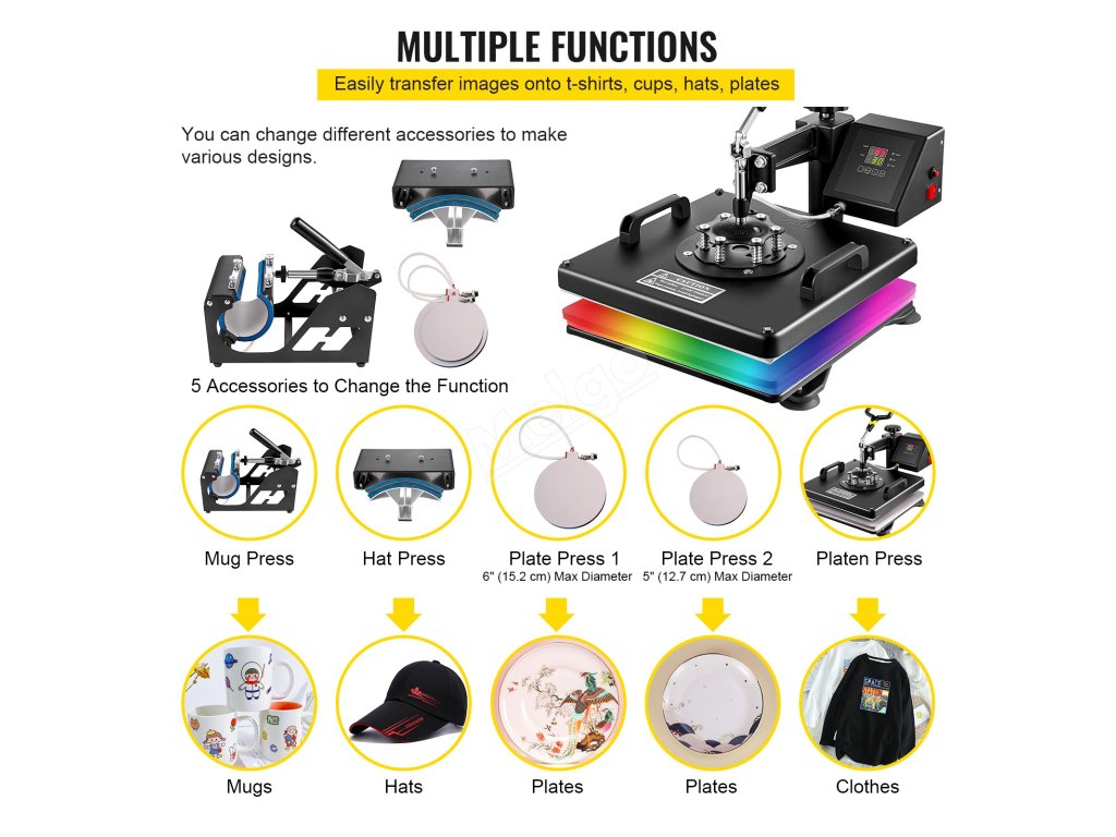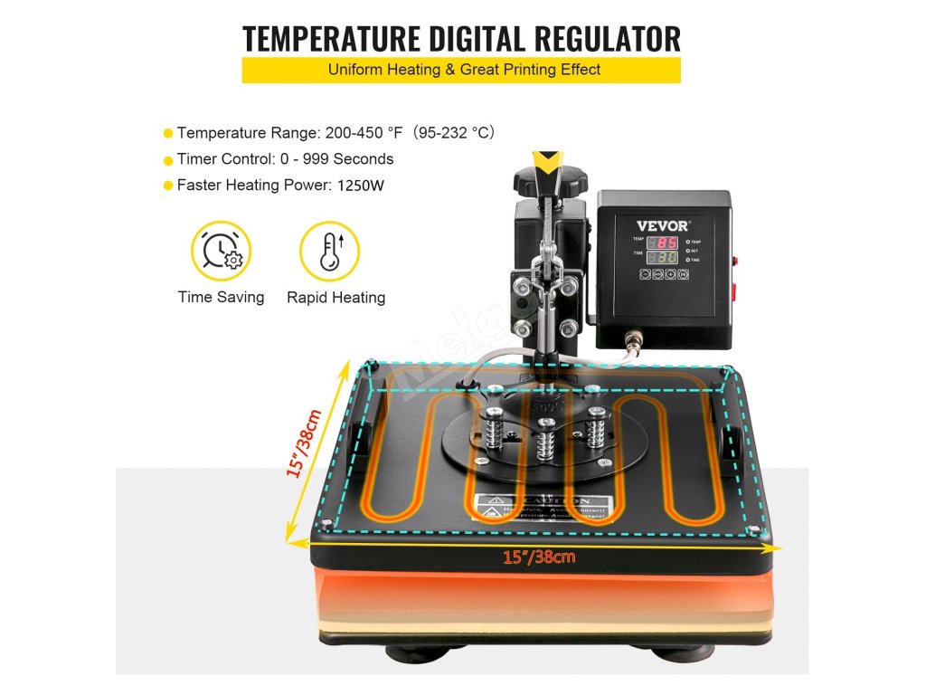 Tepelný lis 5 v 1, 15×15 inch, vyklápěcí, s teflonem a příslušenstvím