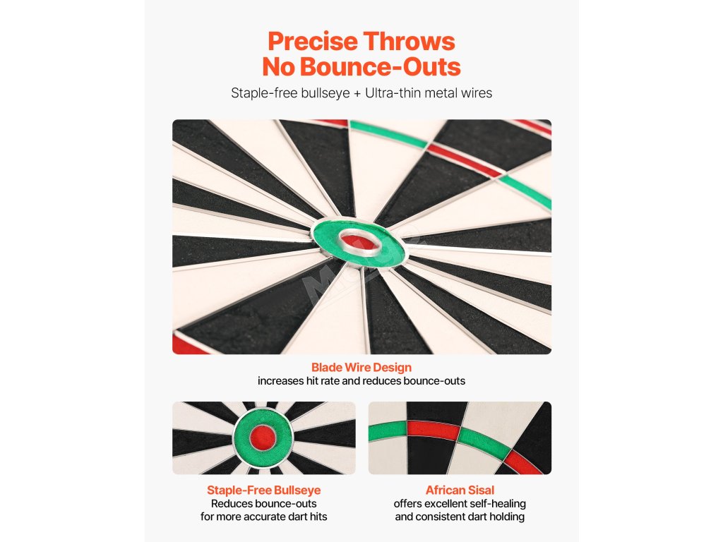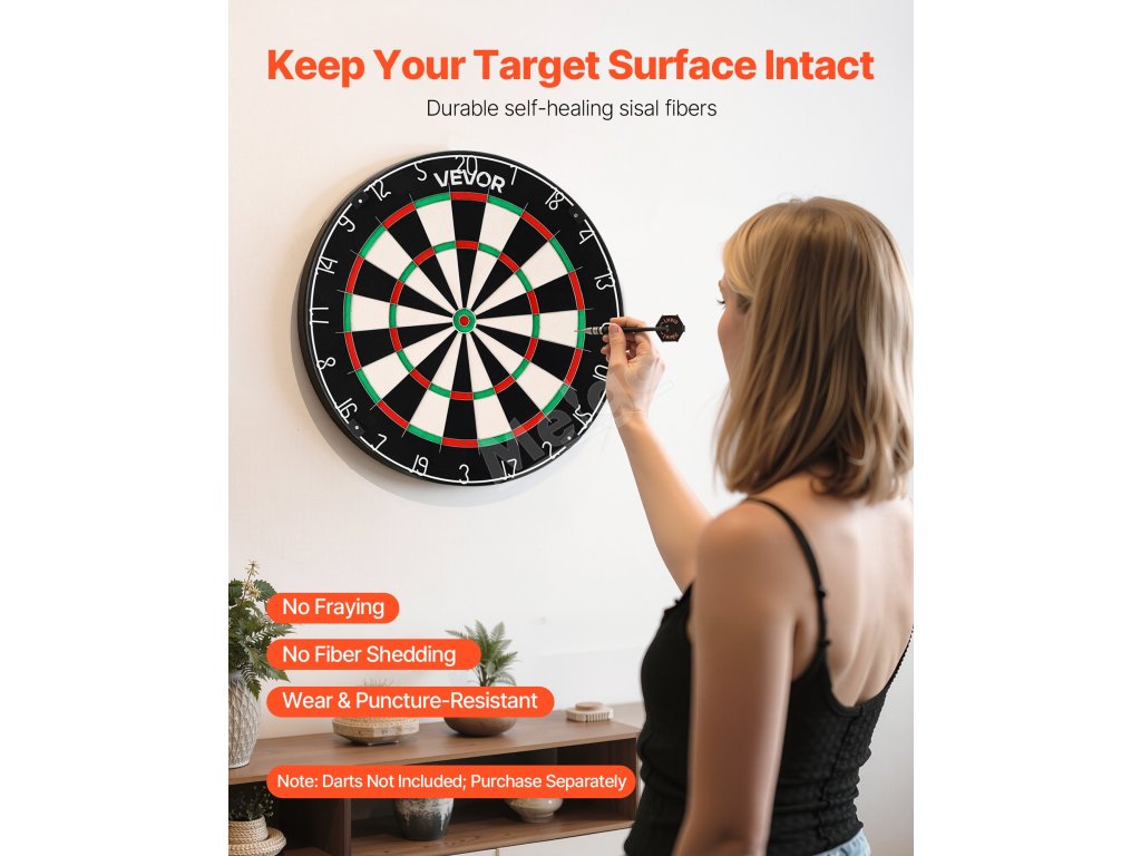Tento terč na šipky je vyroben ze samoregeneračního afrického sisalového vlákna, má terč bez sponek a otočný číselný kroužek, který zvyšuje rychlost zásahů a snižuje počet odskoků, a přináší zábavu a uvolnění při rodinné zábavě nebo setkáních a je dokonalým doplňkem vašeho domova, herny nebo klubovny.