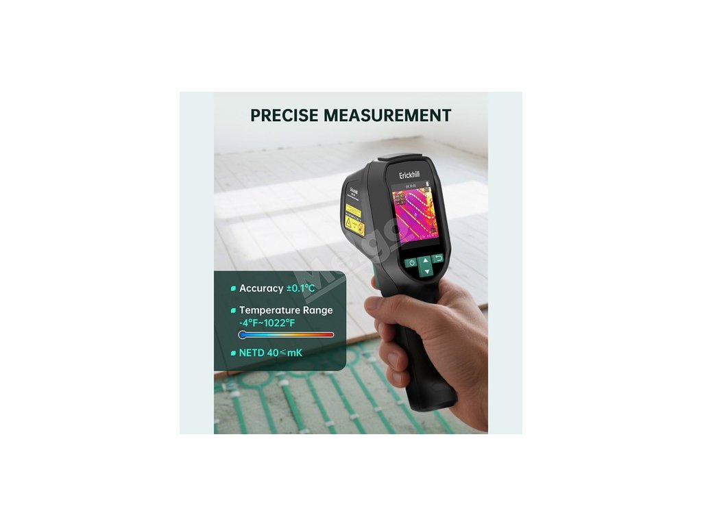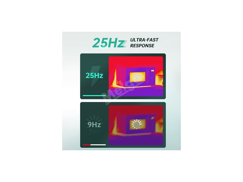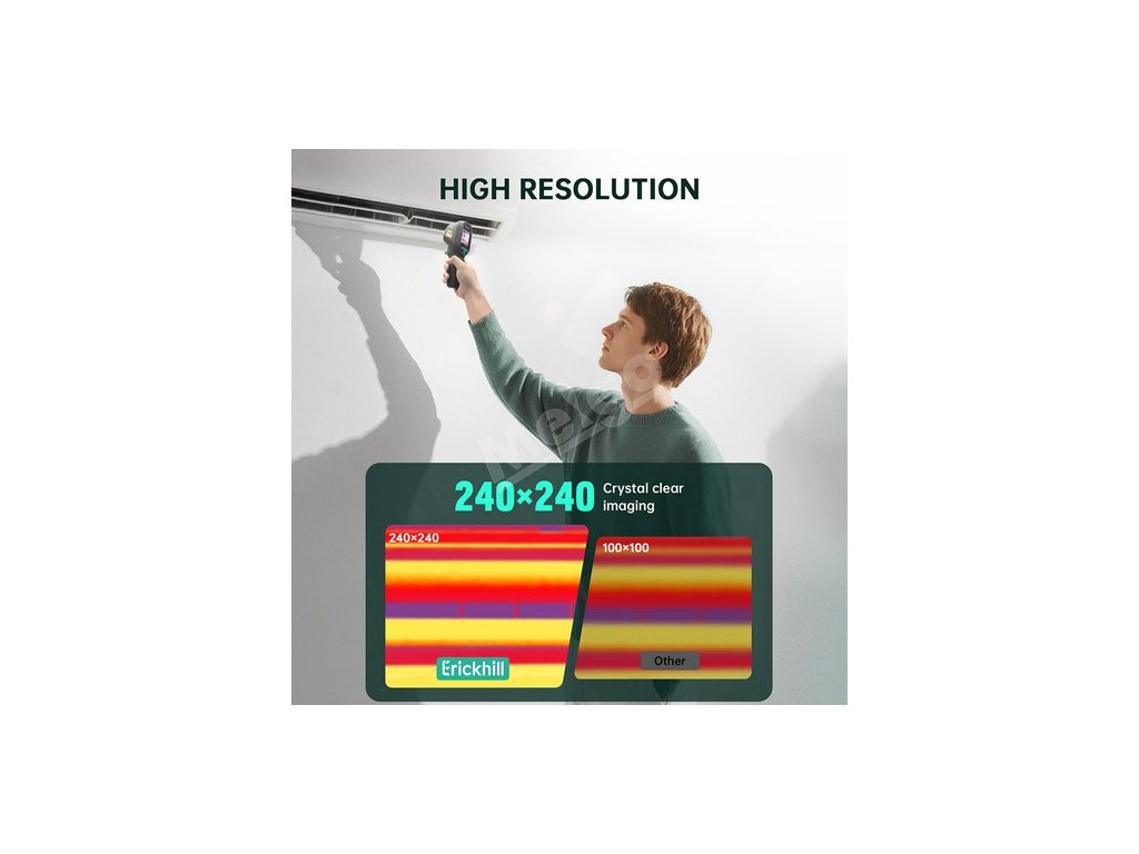 Tato termokamera využívá pokročilou technologii SuperIR, která zvyšuje rozlišení snímače z 96x96 (9 216 pixelů) na 240x240 (57 600 pixelů) pro přesné termální snímání. Ideální pro zjišťování mezer v izolaci domu, úniků vzduchu, poškození vodou, anomálií ve vzduchotechnice a elektrických/mechanických závad s přesností zaměřenou laserem.