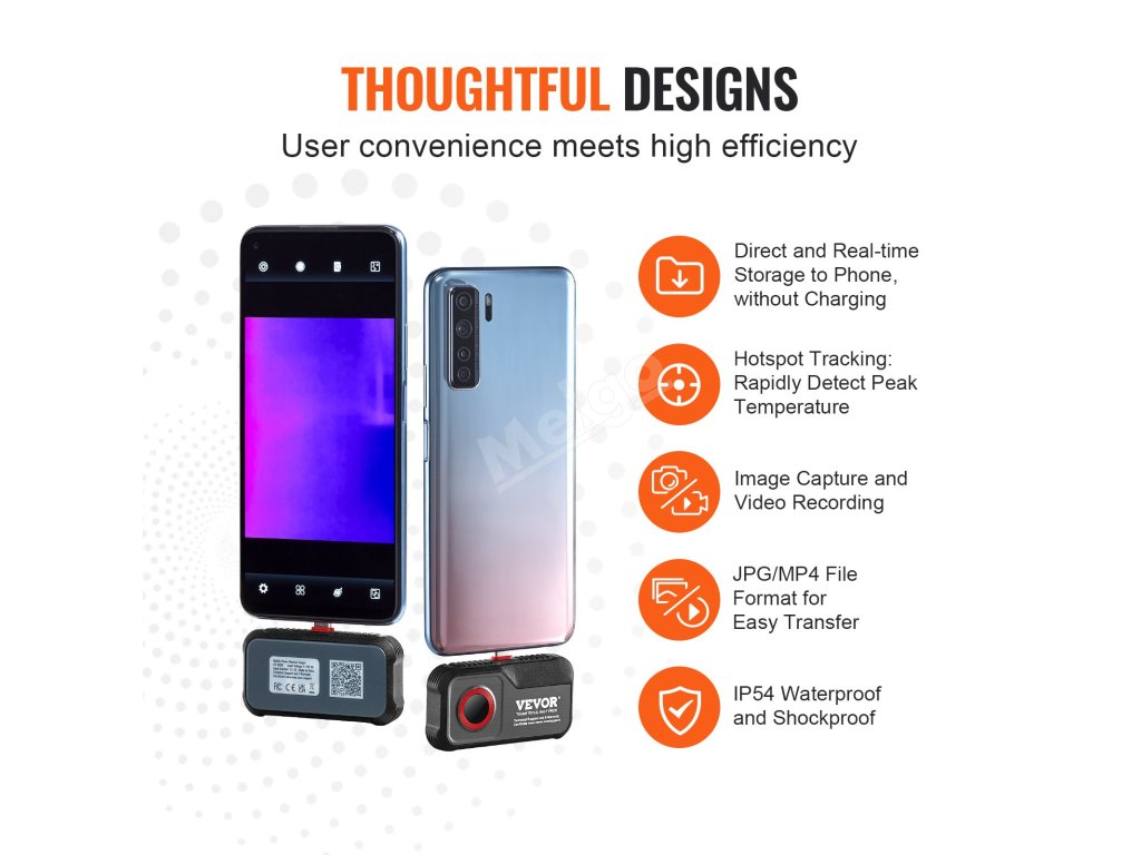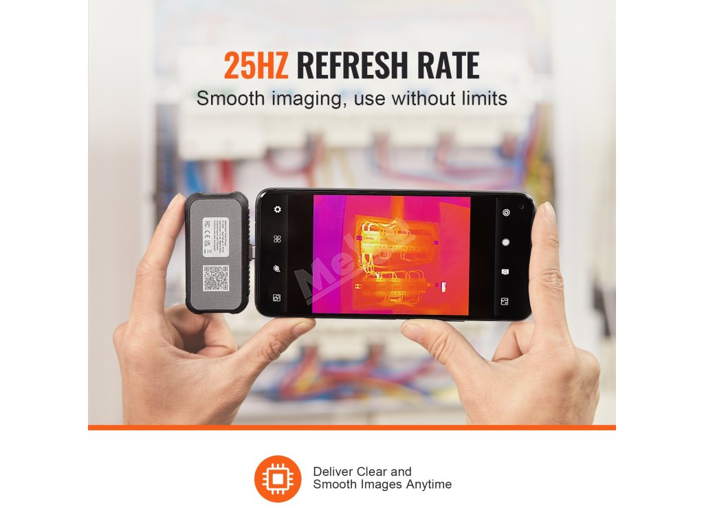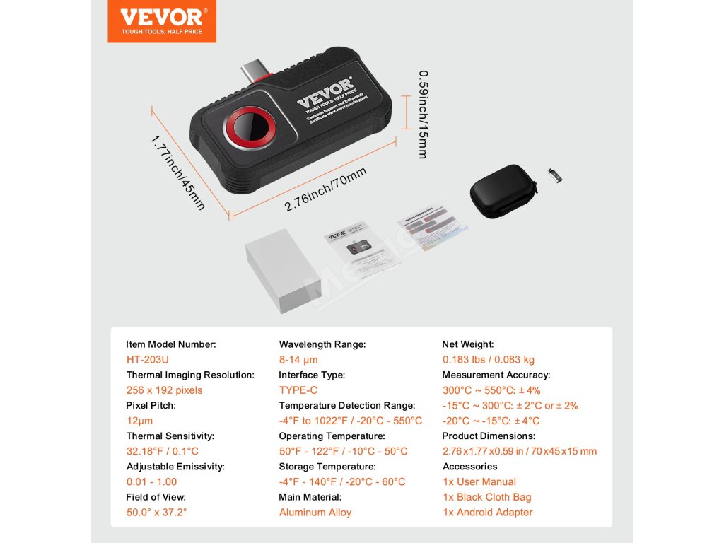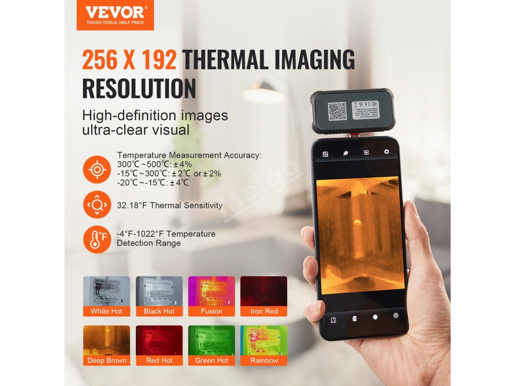 Termokamera VEVOR pro Android s působivým infračerveným rozlišením 256 x 192 poskytuje křišťálově čisté snímky pro přesné určení problémů. Díky snadné kompatibilitě se systémem Android, obnovovací frekvenci 25 Hz a teplotnímu rozsahu -4 až 1022℉ je ideální volbou pro kontrolu domů, vzduchotechniku, instalatérství a další.