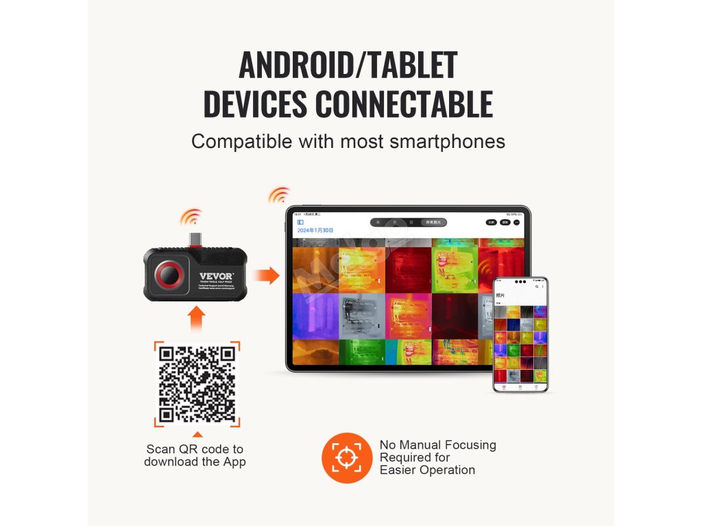 Naše termokamera je kompatibilní s chytrým telefonem/tabletem se systémem Android, aby vyhovovala různým potřebám měření. Po spuštění automaticky zaostří, takže není nutné ruční nastavení zaostření. Podporuje také sledování hotspotů, pořizování fotografií a nahrávání videa.