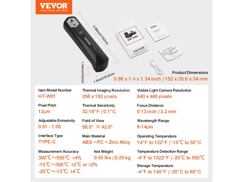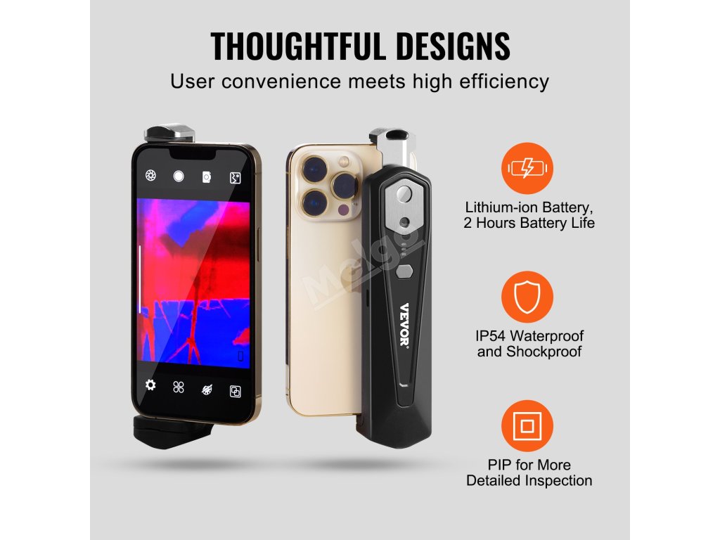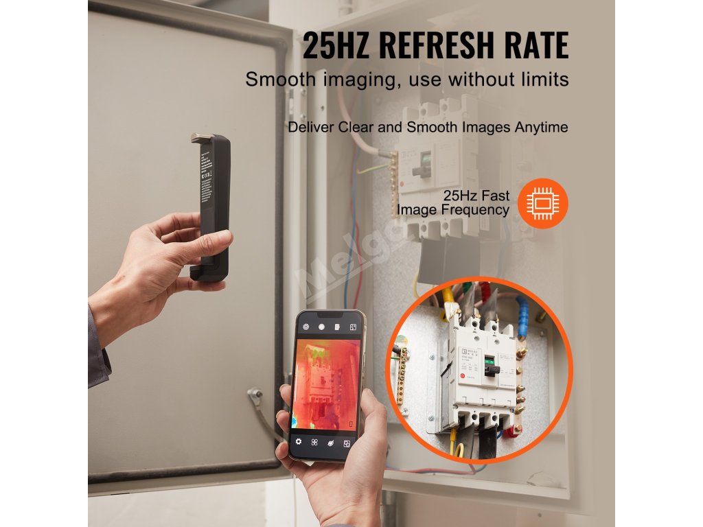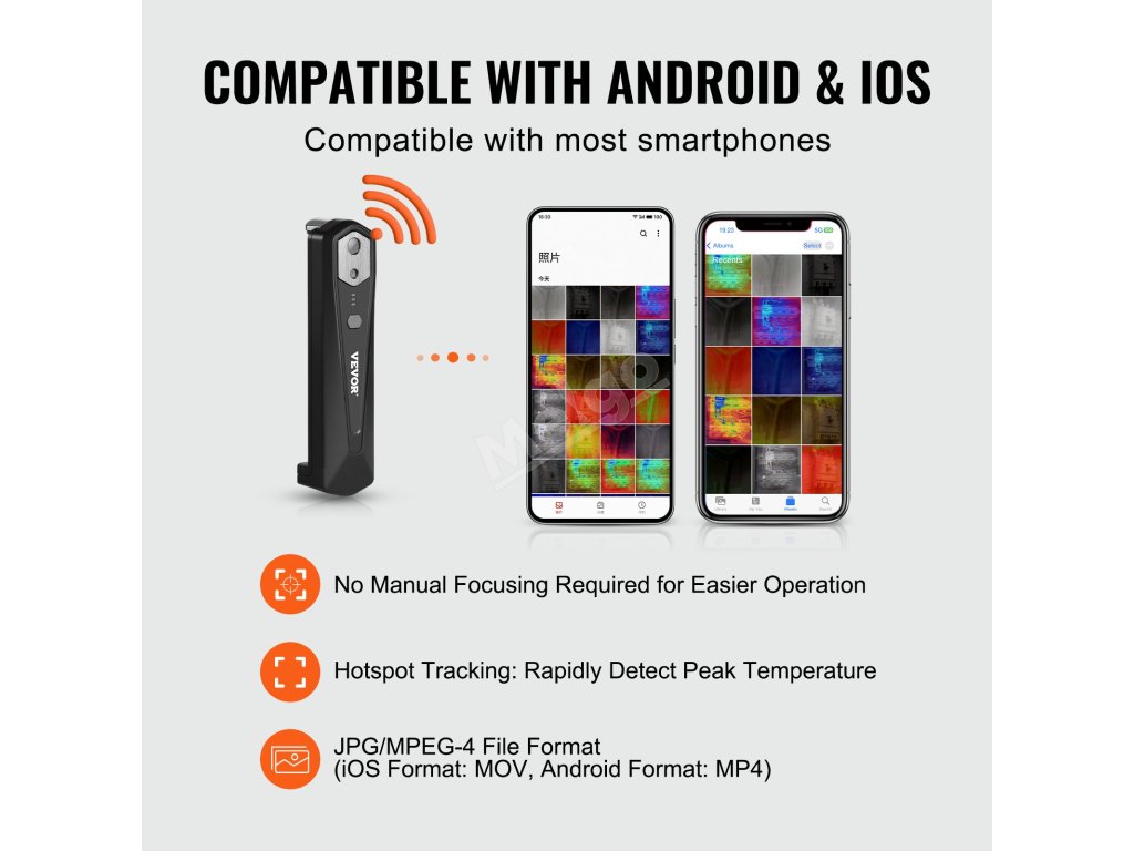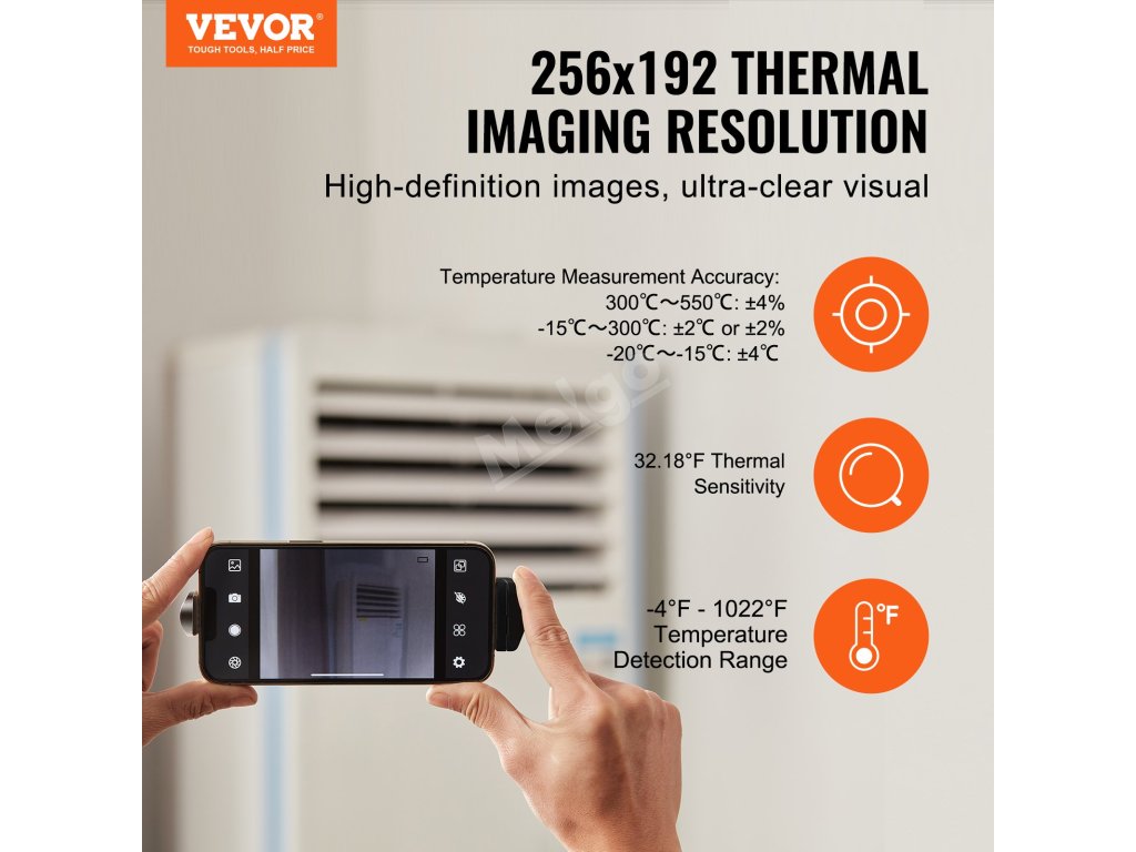 Termokamera VEVOR pro Android a IOS s působivým infračerveným rozlišením 256 x 192 poskytuje křišťálově čisté snímky pro přesné určení problémů. Díky bezdrátovému přenosu dat, obnovovací frekvenci 25 Hz a teplotnímu rozsahu -4 až 1022℉ je ideální volbou pro kontrolu domů, vzduchotechniky, instalatérství a další.