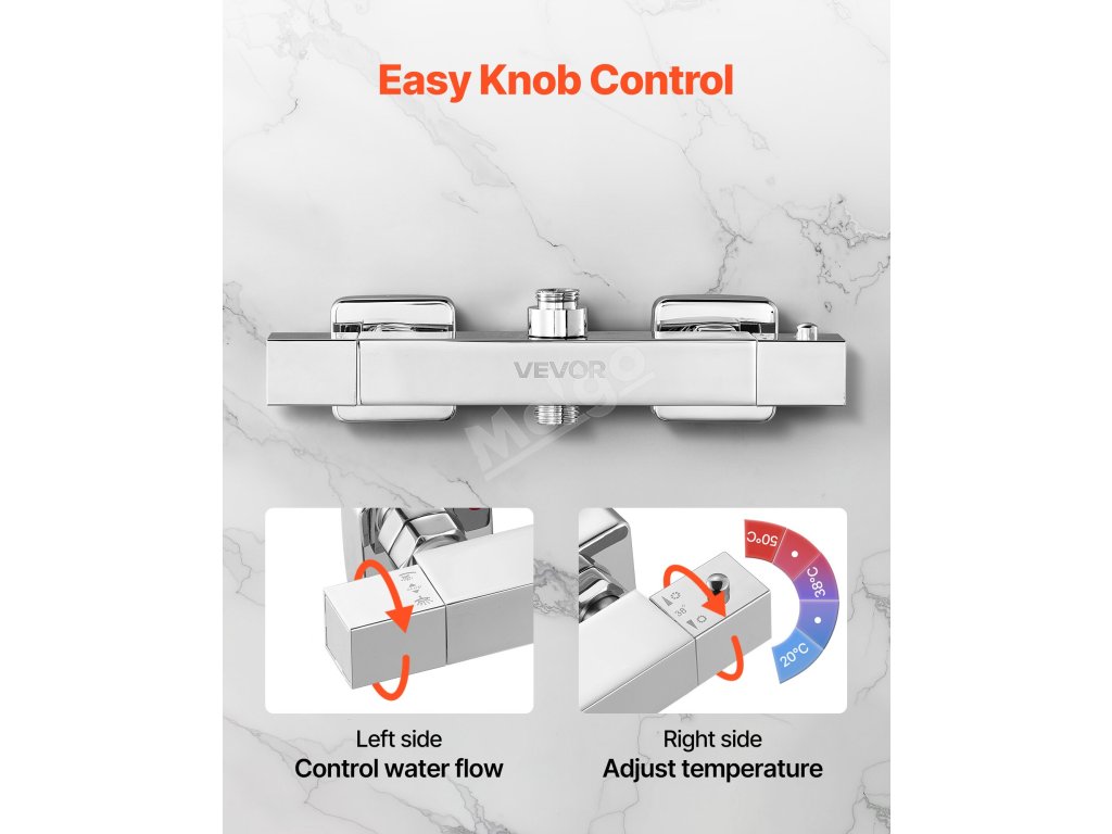 Tento termostatický směšovací ventil VEVOR kombinuje ovládání dvěma knoflíky pro přesné nastavení teploty a průtoku vody. Od mírného oplachování až po silné sprchování - užijte si stabilní a spolehlivý výstup vody, který vyhovuje všem ve vaší domácnosti. Udělejte si každé sprchování bez námahy a příjemné.