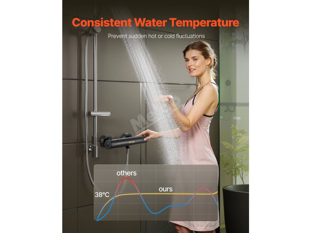 Termostatický směšovací ventil VEVOR je vybaven dvěma knoflíky pro ovládání teploty i průtoku. Ať už dáváte přednost jemnému oplachování nebo silnému proudu, při každém sprchování poskytuje stabilní výstup vody. Dokonale splní potřeby vaší rodiny díky plynulému a spolehlivému výkonu.
