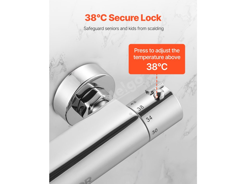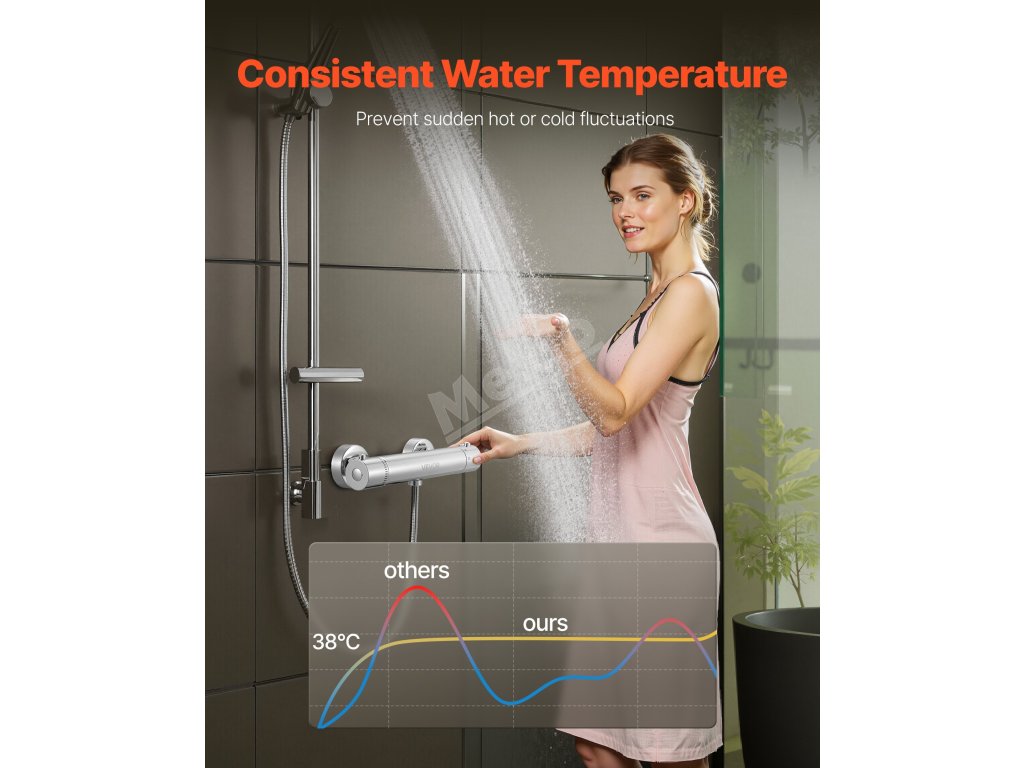 Zlepšete si zážitek ze sprchování s naší termostatickou sprchovou baterií. Jedním otočením nastavíte teplotu vody na 38 °C/100 °F - už žádné neustálé nastavování. Užijte si stabilní teplotu a tlačítko proti opaření při vyšších teplotách. Odolná mosazná konstrukce zajišťuje dlouhodobé používání bez úniků.