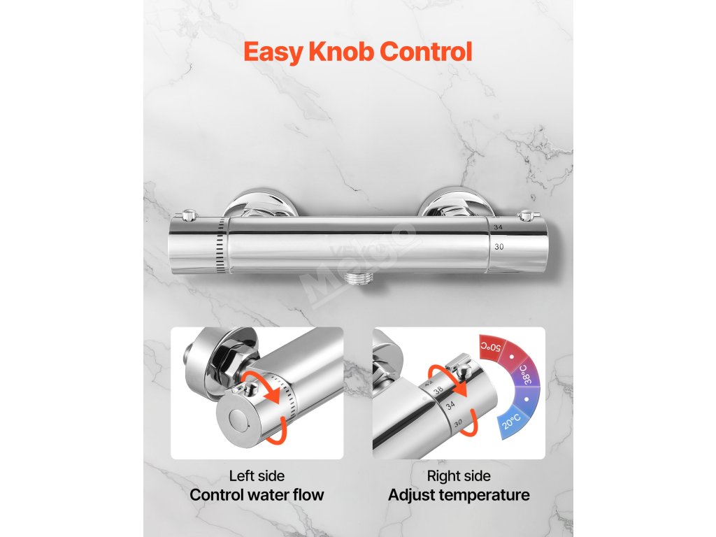 Tento termostatický směšovací ventil VEVOR kombinuje ovládání dvěma knoflíky pro přesné nastavení teploty a průtoku vody. Od mírného oplachování až po silné sprchování - užijte si stabilní a spolehlivý výstup vody, který vyhovuje všem ve vaší domácnosti. Udělejte si každé sprchování bez námahy a příjemné.