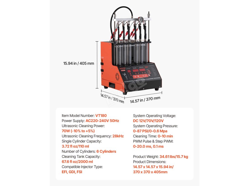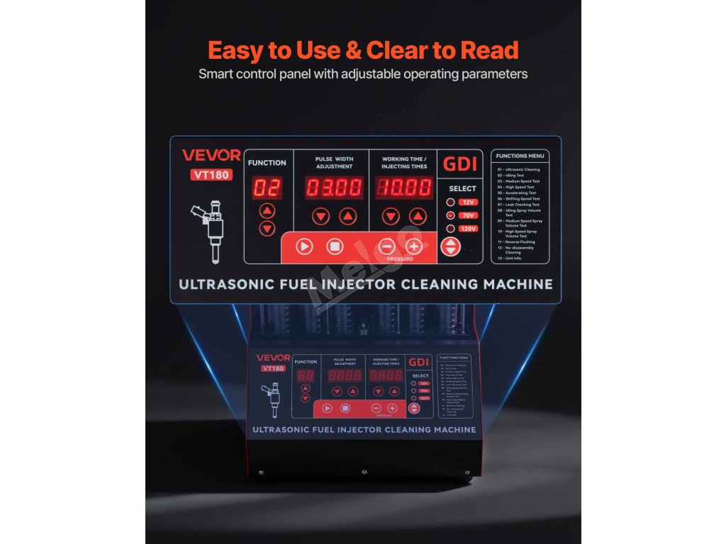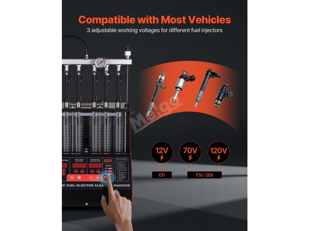 Tento čistič vstřikovacích ventilů nabízí 3 volitelná napětí a je kompatibilní se vstřikovacími ventily EFI, FSI a GDI a podporuje motory Mercedes, BMW, Audi, Porsche, Ford a další motory s přímým vstřikováním.