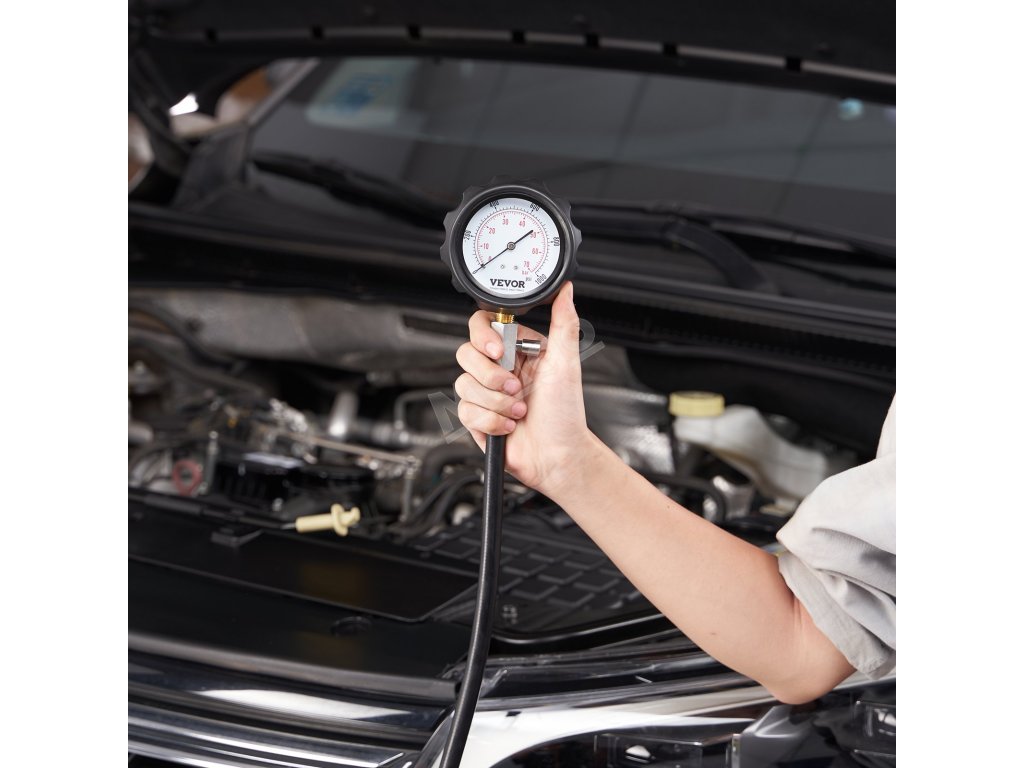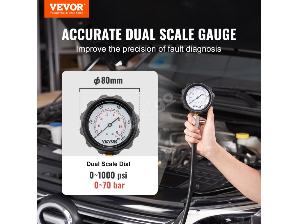 Naše sada pro testování komprese vznětových motorů je vybavena tlakoměrem o velkém průměru 80 mm, který je uzavřen v nárazuvzdorném pryžovém pouzdře. Měřidlo se dvěma stupnicemi poskytuje přesné údaje v rozsahu 0 až 1 000 psi a 0 až 70 barů, což umožňuje přesnější diagnostiku stavu motoru.
